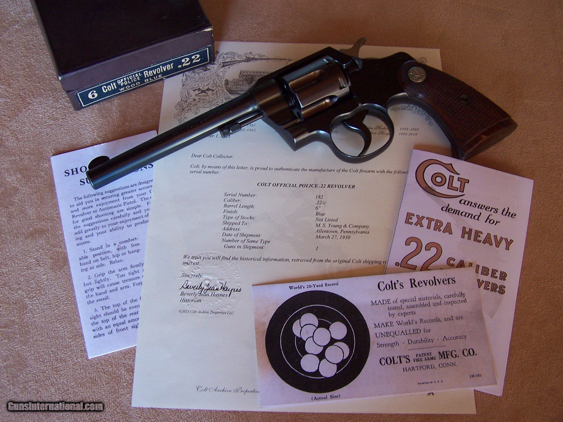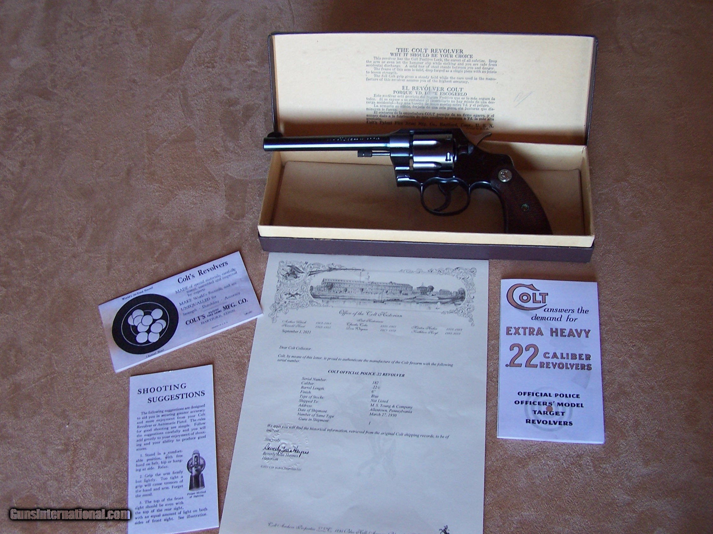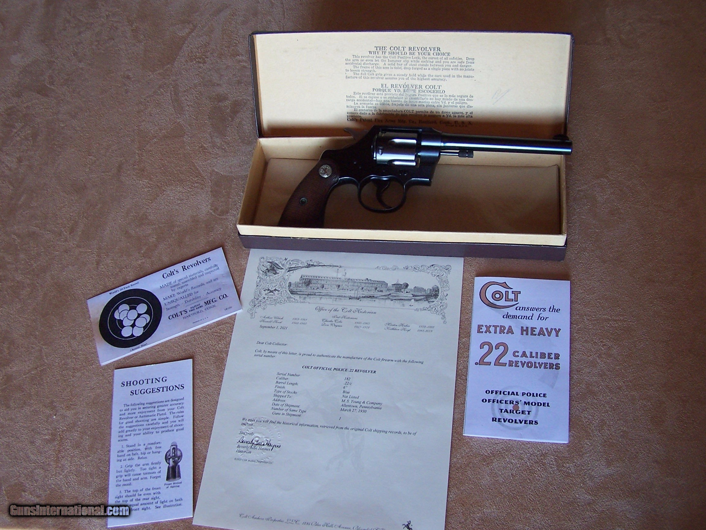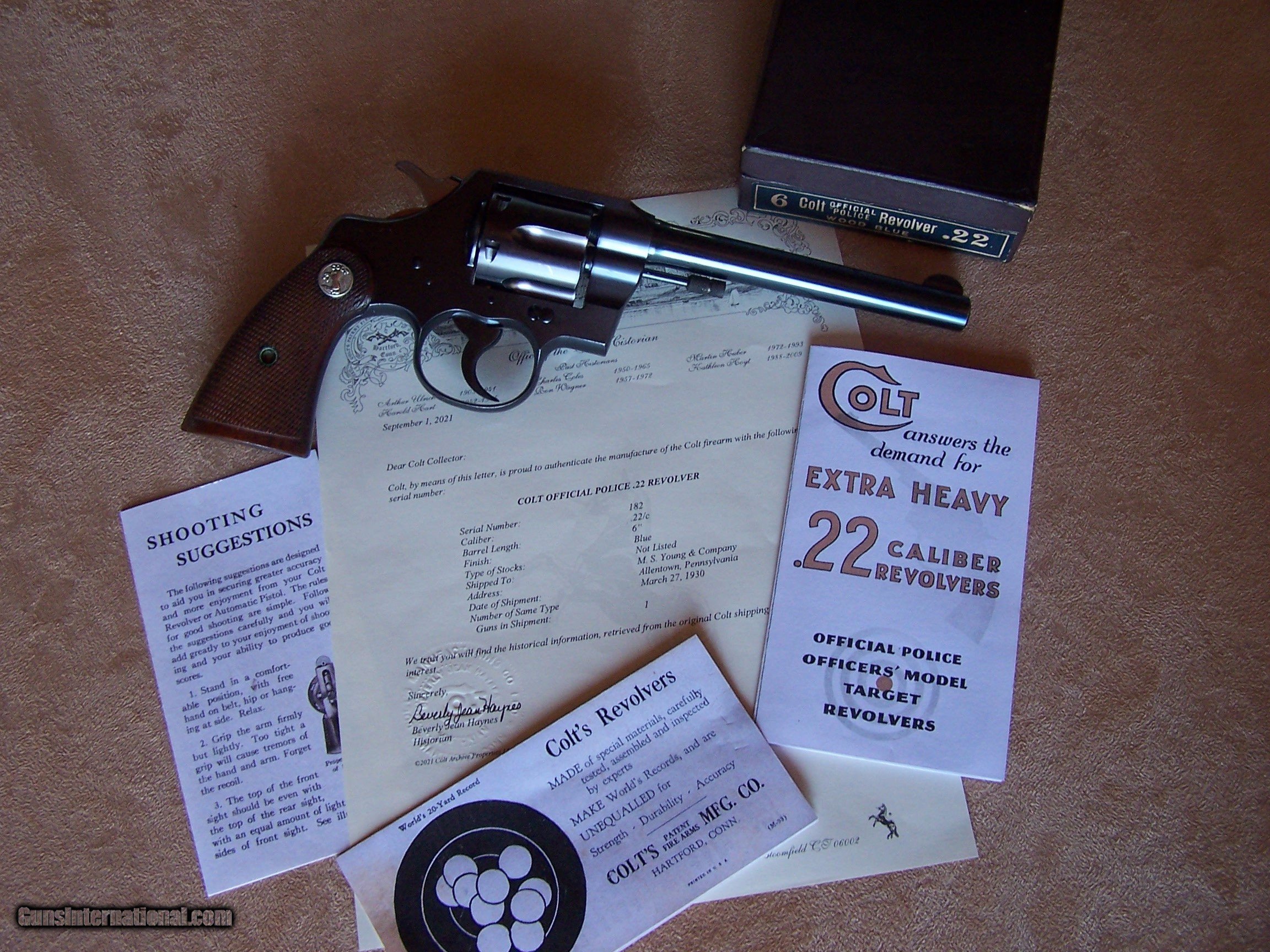 Colt Official Police .22 with 6” Barrel as New with Box & Paperwork S/N 182