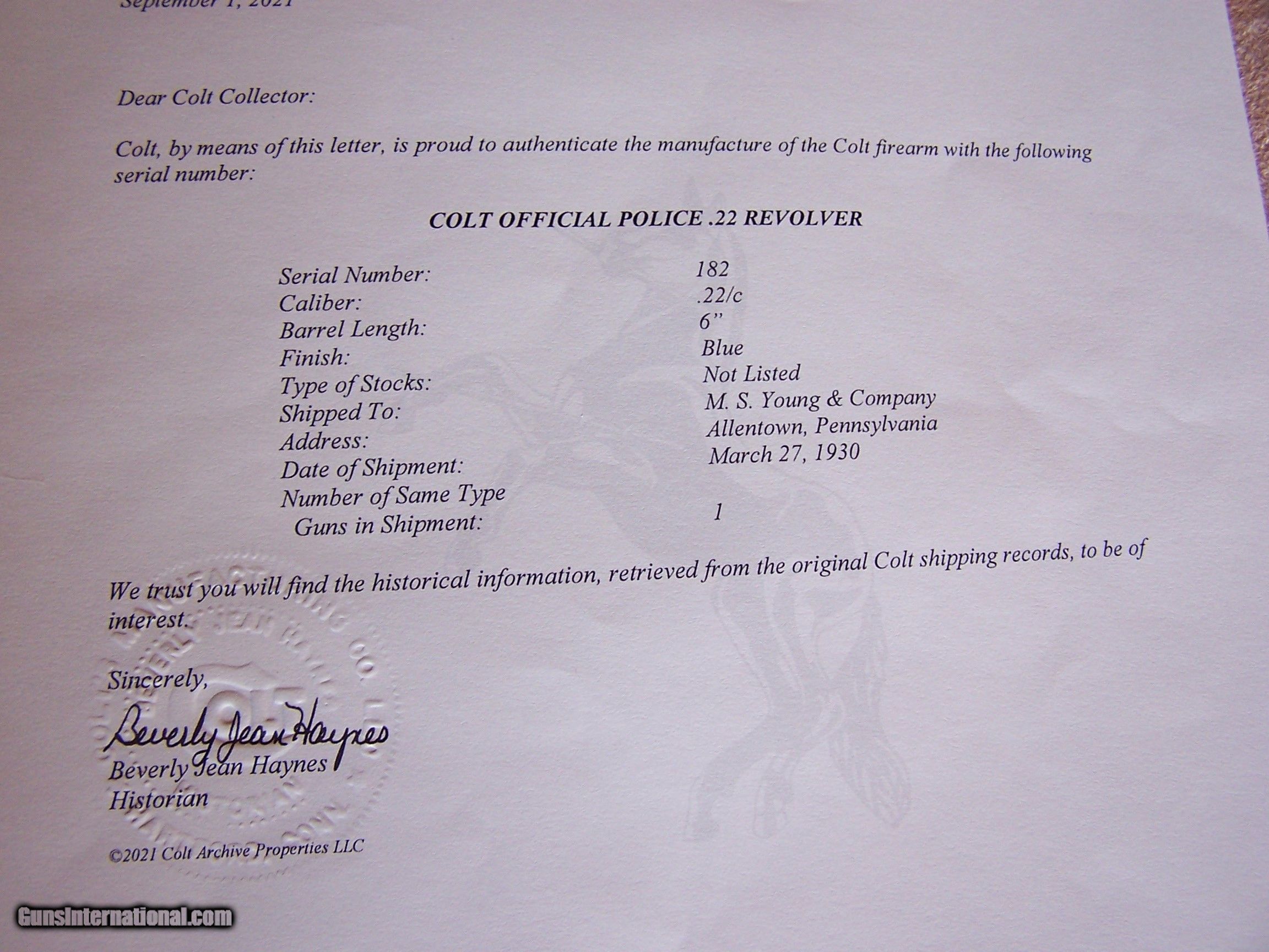 Description: A highly collectible Colt Official Police .22 that was probably made in the first couple of days of production. It has the 6” barrel and comes with the original box and paperwork. The Colt factory letter shows that it was shipped on March 27, 1930 to M.S. Young & Company in Allentown, Pennsylvania. The gun remains in 99+% condition and does not look like it has ever been fired. As far as the finish, action, bore & grips, they are all like new. I do see one hairline small mark on the left side of the barrel. The original box numbered to the gun also remains in excellent condition. This is one that has been salted away in my collection for many years. If you want the best then this one would be difficult to beat. I offer a three day non firing inspection period and always want the buyer to be satisfied with their purchase. The gun will be packed correctly and shipped via FedEx Air with insurance to your FFL dealer in the continental United States for $55 (California is extra because I have to ship through my local dealer). This gun requires a C&R or FFL license for transfer. I ship the following day after the payment arrives and provide tracking information. Please see my other Colts and various collectible firearms that I have listed. Thanks for your interest and please let me know if you have any questions. Price is $3250.00 plus shipping. Please Note: A same as cash price Lay-A-Way plan is available on this gun. Please call to discuss. Sold Pending Funds SOLD Curio/Relic: Yes Handgun Caliber: .22 Long Rifle Manufacturer: Colt Model: Official Police Serial Number: 182 Barrel Length: 6 Condition: 99%+ Metal Condition: 99%+ Wood Condition: 99%+ Bore Condition: As New Action: Double Action Finish: Colt Factory Bluing Manufacture Date: March 27, 1930 Extras: Original box and paperwork Item Location: Tennessee |