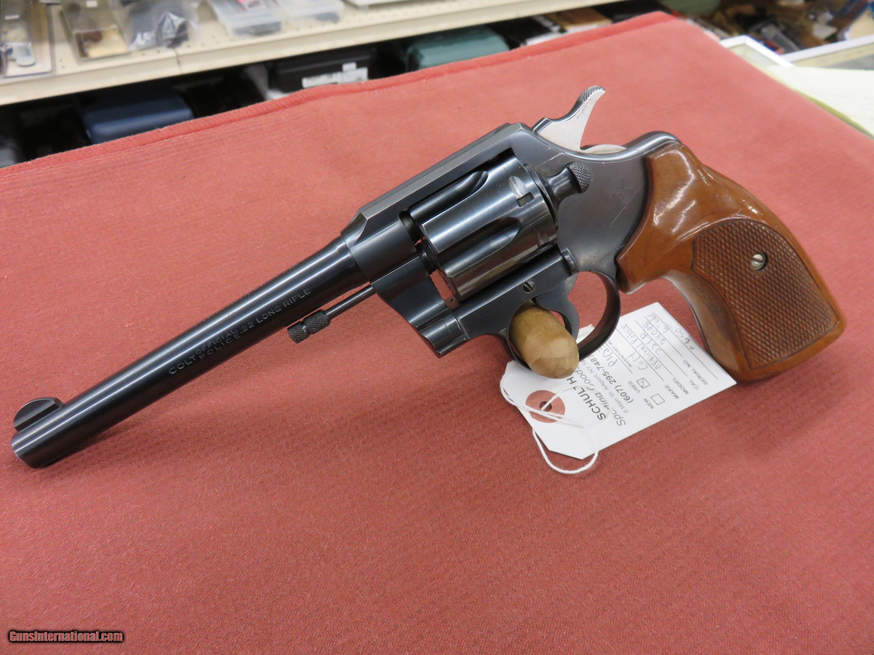 Description: Colt Official Police, 22LR, 6" bbl, serial # 24XXX, fixed read sight, 95% blue overall, wood grips. SOLD |