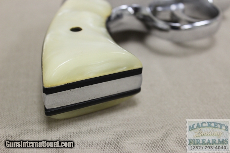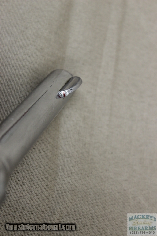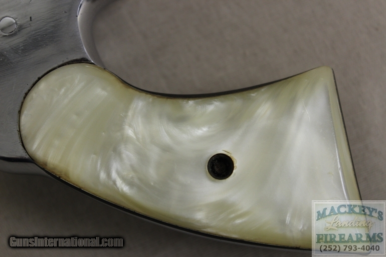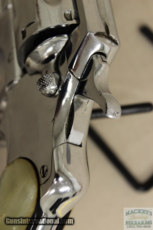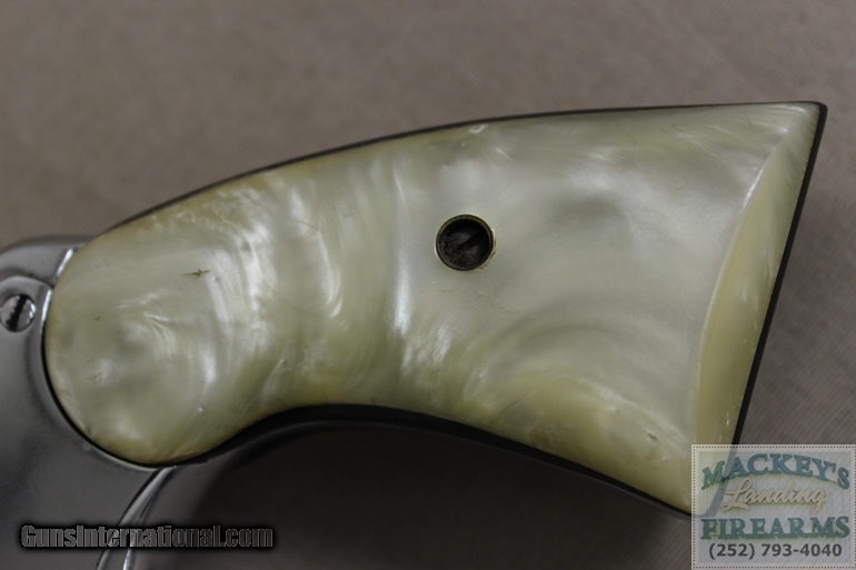 Description: Colt Official Police nickel revolver in 32-20, 4" 1938 Medium frame, double-action, six-shot fluted cylinder, half moon blade front sight, and open fixed rear sights. Checkered trigger, hammer, ejector pin, and cylinder release, smooth pearlized grips. Some light pitting is visible. Action is smooth. For more information call 252-793-4040. Please reference our inventory # 48540. FFL required for shipping. No shipping outside the US. SOLD |
