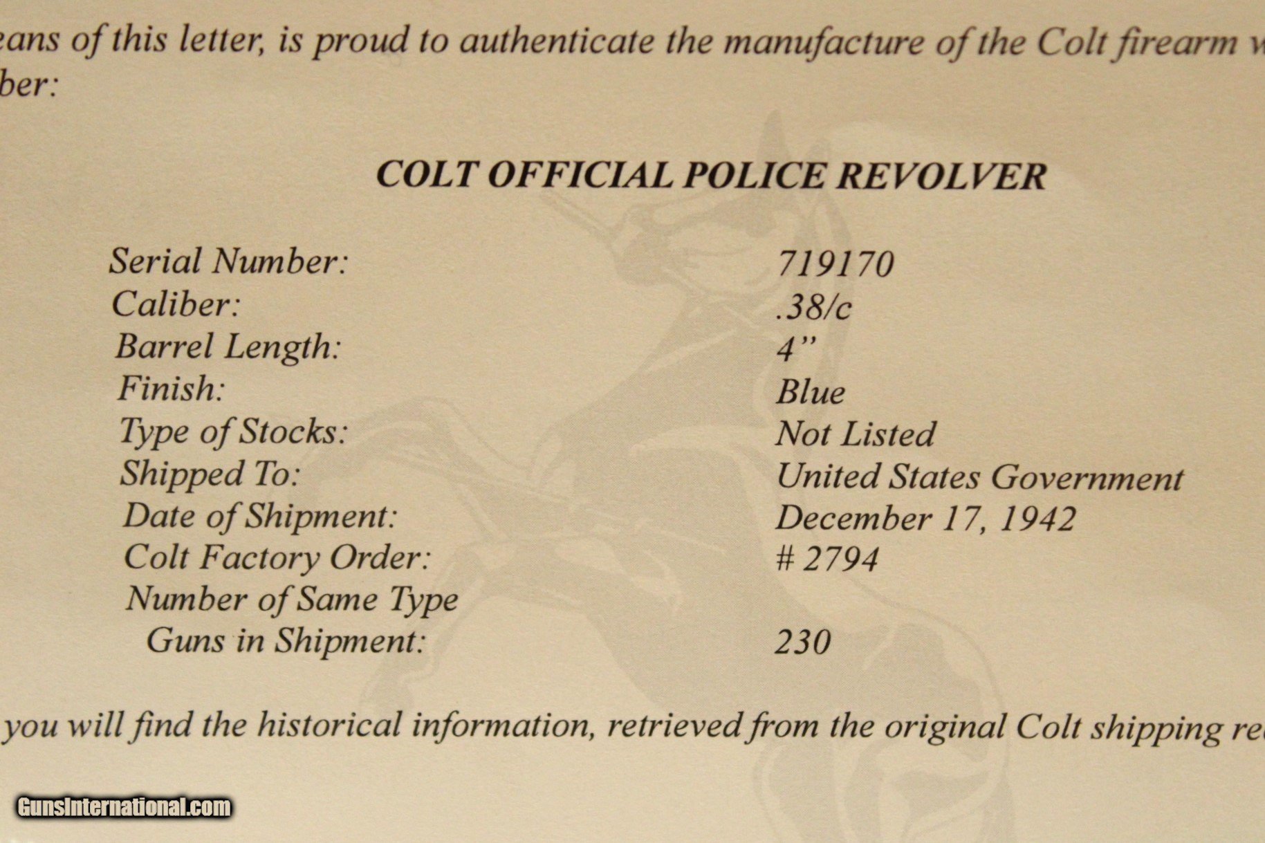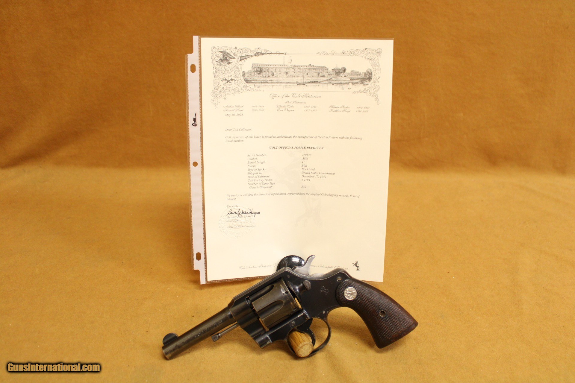 Colt Official Police w/ Factory Letter (4-inch, Blued, WW2, Mfg 1942)