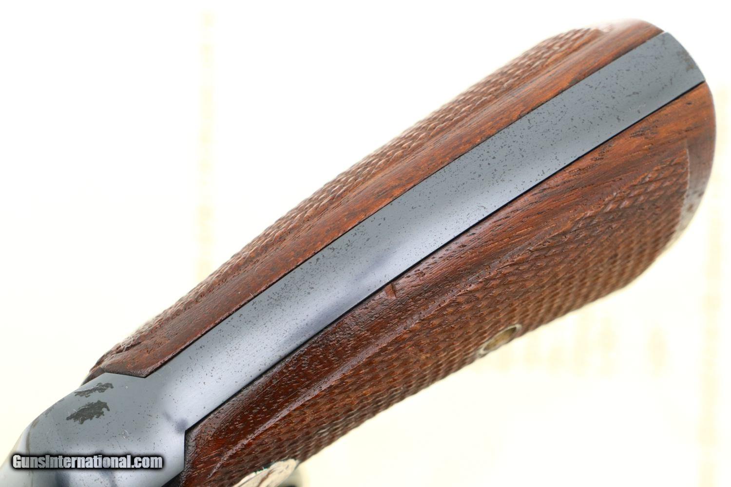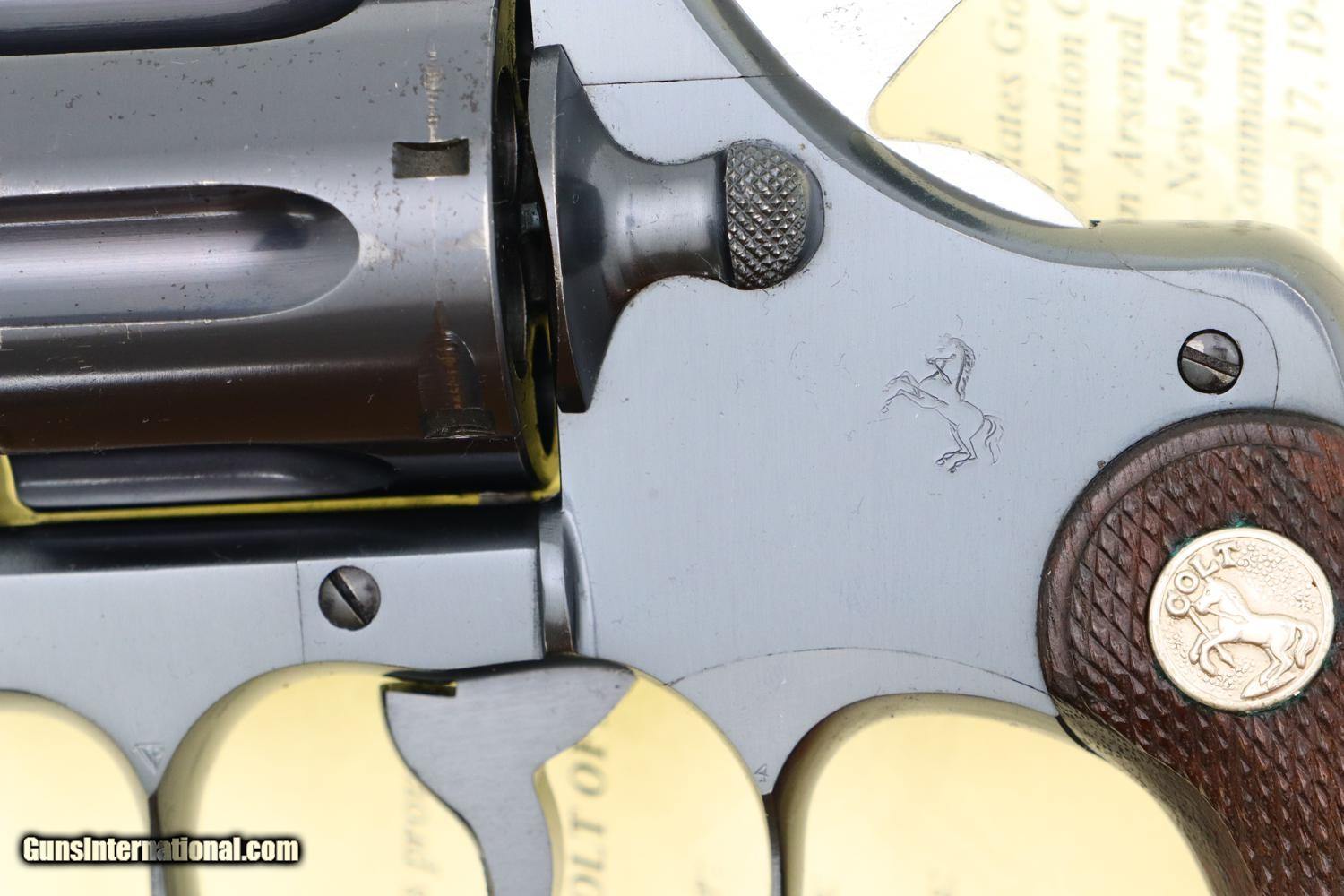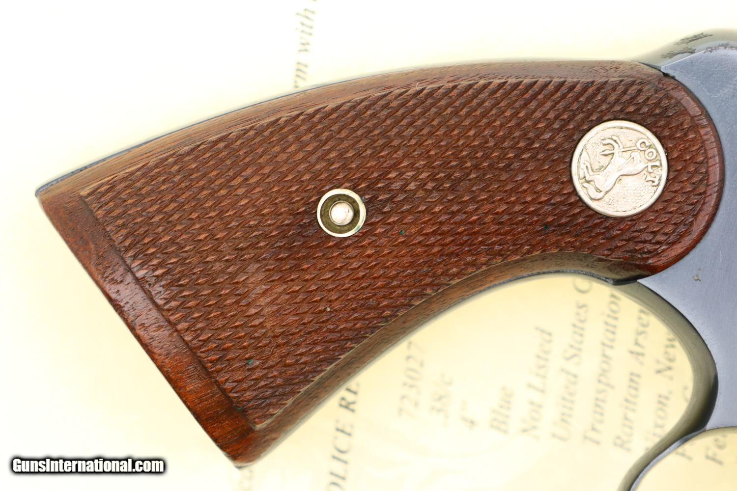 Description: Synopsis: Fantastic Colt Official Police, Military Accepted, Factory Letter, 723027, FB01238 Description: Extraordinary Colt Official Police, caliber .38, blued with wood checkered grips, shipped in Feb 1943 per factory letter to Raritan Arsenal in Nixon, NJ. Standard configuration Colt Official Police with 4” barrel having fixed sights. Colt patent marking on top of the barrel with model/caliber on left side. Left upper rear of frame marked with ordnance bomb. Rampant Colt on sideplate. Full serial number on left side of frame and crane. Fitted with wood checkered grips having silvered Colt medallions. Accompanied by crisp factory letter dated Oct 2014 and signed by Colt Historian Beverly Haynes. Condition: Near mint with negligible sharp edge wear and the finest freckling on careful inspection, most noticeable on backstrap. Sharply checkered grips with a few handling impressions as carefully photographed. Mirror bore. Perfect manual mechanics. It would be very very very difficult to upgrade this Martial marked Colt Official Revolver with corroborating factory letter. ~~Insured shipping fee of $75; most packages shipped using FedEx 2nd Day.~~ SOLD Curio/Relic: Yes Manufacturer: Colt Serial Number: 723027 Caliber Info: 0.38 Special |
