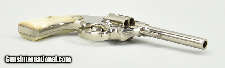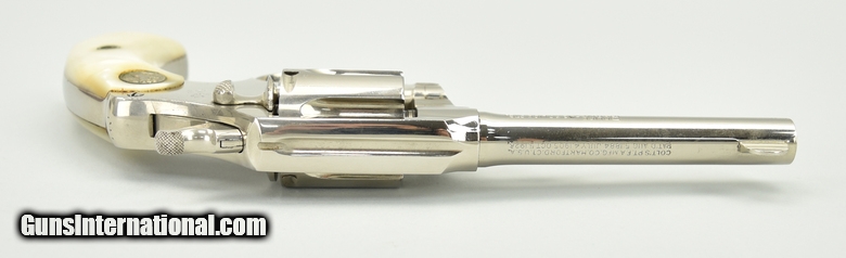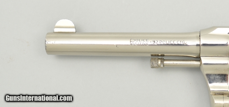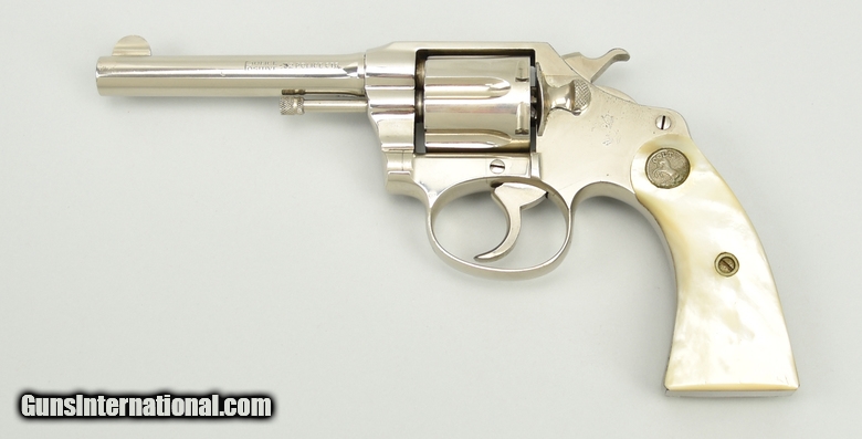 Colt Police Positive .32 Police caliber revolver. Pre-war double action revolver with 4” barrel, nickel finish and genuine pearl grips. The gun is in excellent condition with a few handling marks. The grips are beautiful with Colt medallions, and no chips or cracks.