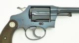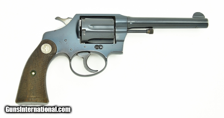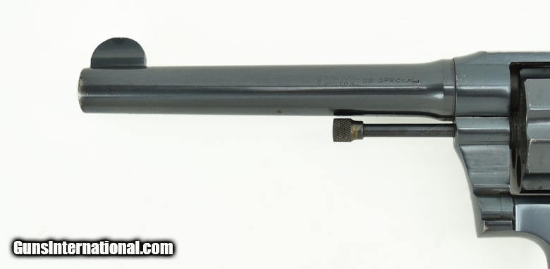 Colt Police Positive Special .38 Special caliber revolver with a 5” barrel. Made in 1928. Metal has 90% of the finish. Bore is excellent. Grips are checkered wood. Light spotting in the finish.