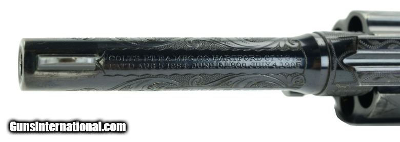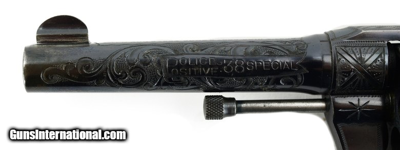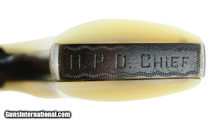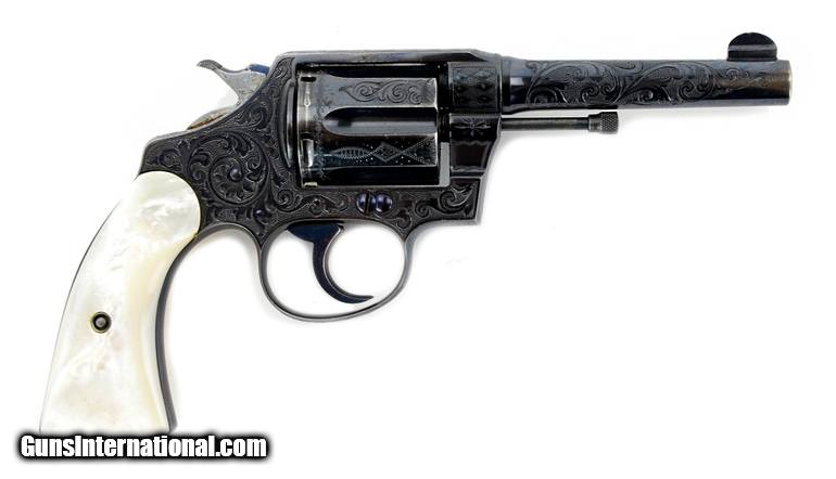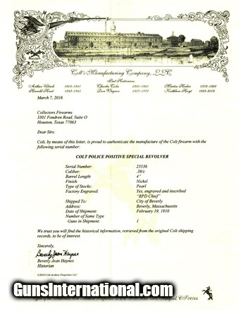 Description: " Colt Factory Engraved Police Positive with pearl grips .38 Special caliber revolver. Made in 1910. Beautiful gun with the high luster blue. This gun is in excellent condition with 95%+ of the original blue. Bottom of the butt is engraved “B.P.D CHIEF” According to the letter, this gun was shipped to Beverly, Massachusetts and was shipped directly to the city of Beverly. This gun letters as both being factory engraved and inscribed with the “B.P.D CHIEF” inscription. Grips are pearl and fit perfectly and while the letter calls for pearl grips, we believe these to be replacements. This gun conforms to the letter with the exception of the finish; the letter calls for nickel, and this gun is blued. That being said, this is obviously a Case of a factory error and the blue finish is guaranteed to be 100% factory original. Great gun that should be researched further to see who the police chief was at this period. SOLD Curio/Relic: Yes |