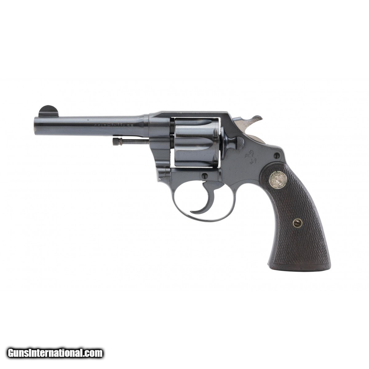Second issue manufactured in 1930. Bore is excellent. Action works properly. Approximately 98% original blue finish. Grips have some wear. Barrel is 4"". Grips are walnut and have some light wear. Very good plus overall condition.