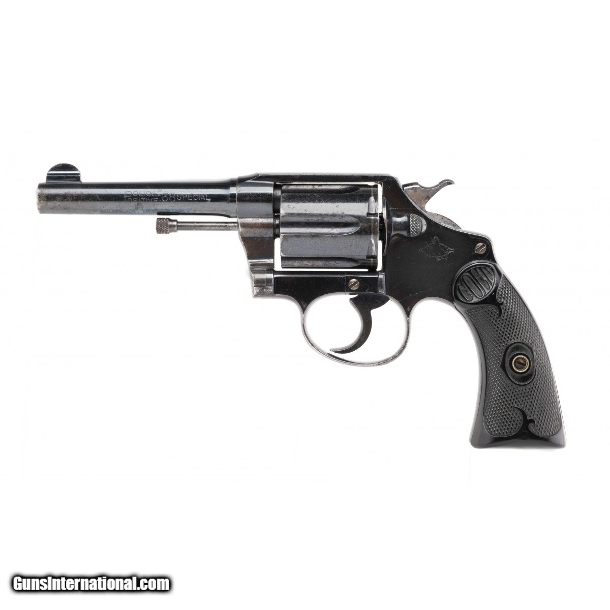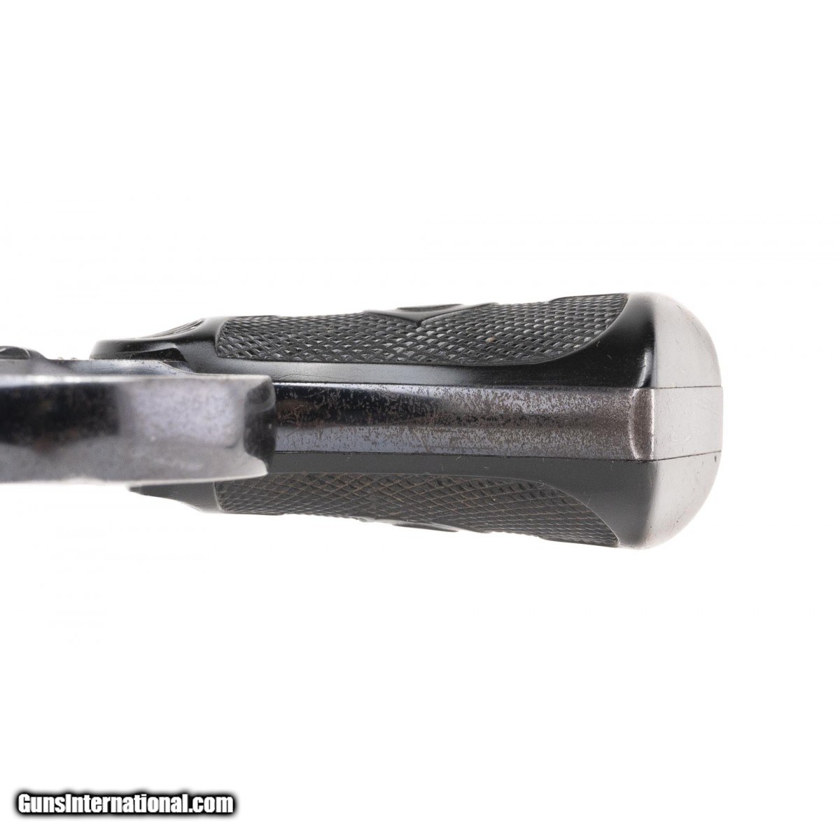 Description: " Pre-war service revolver made in 1912. Has a 4"" barrel, blue finish and hard rubber grips. The bore has some areas of pitting and is good. Has about 85% original blue. The grips are not chipped or cracked. Action locks up tight. A vintage .38 Special revolver. SOLD |