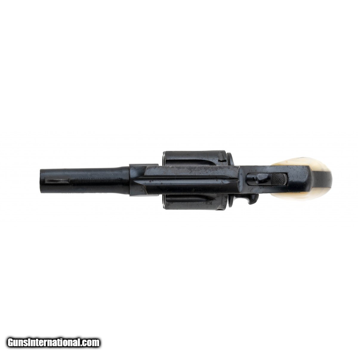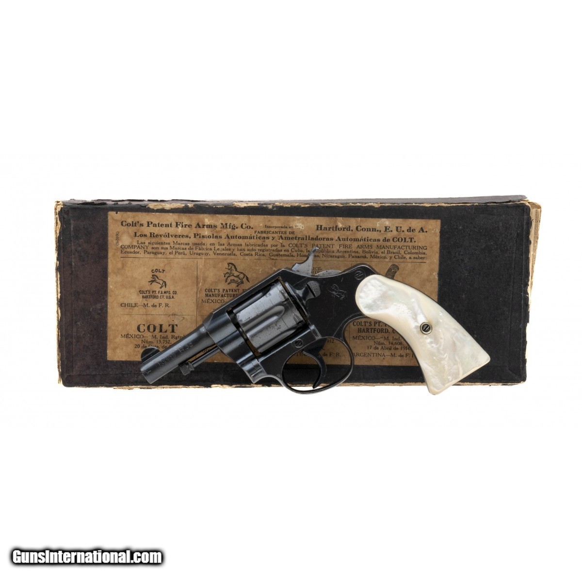 SN: 182121. Pre-war small frame revolver made in 1922. Has 2.5"" barrel and what appear to be beautiful factory pearl grips. The finish is speckled on the frame, overall the gun is very good with about 90% original blue. Bore and action are excellent. Comes with a period ""Pequeno"" box with a label that says ""Pearl Blue"" and ""Pequeno"" on the end and has Spanish language Colt advertising label on the lid. This gun is not in the serial number range of the Pequeno's, but it's a neat box.
