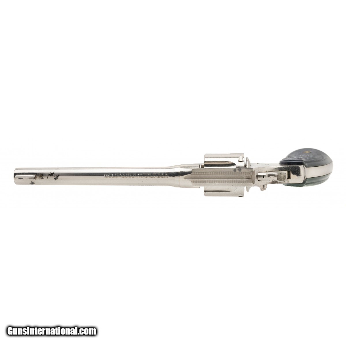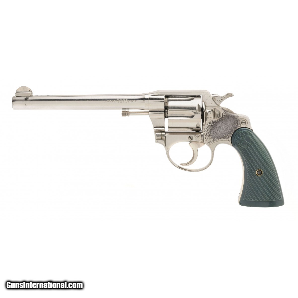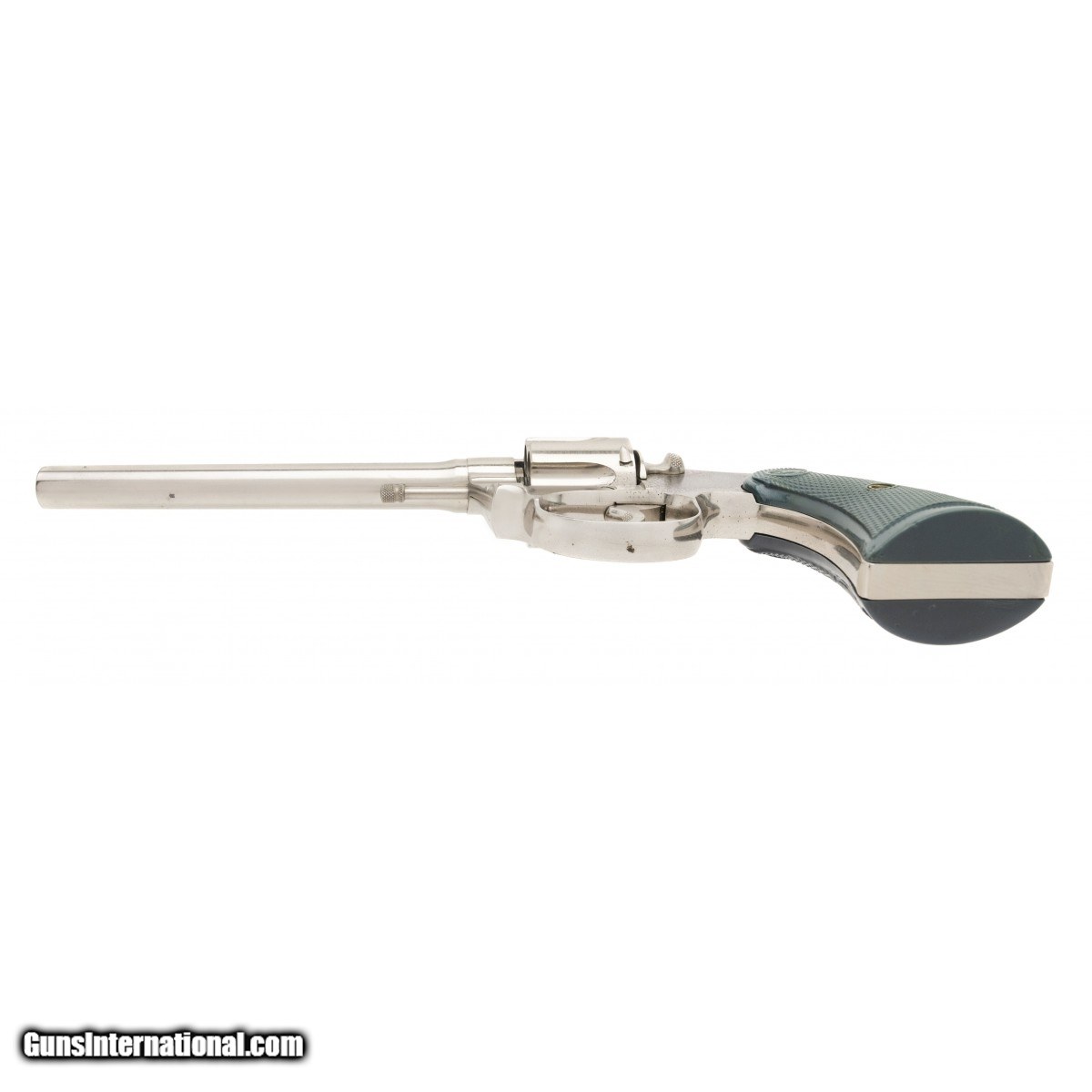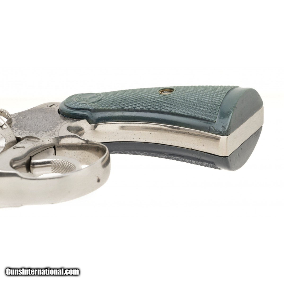 Description: "SN: 326940. Pre-war revolver made in 1926. .38 New Police (.38 S&W) with a 6"" barrel. Bore is excellent. Grips are a later replacement. Metal has approximately 80% original nickel plating with flaking on left side plate. Very good overall condition. SOLD |