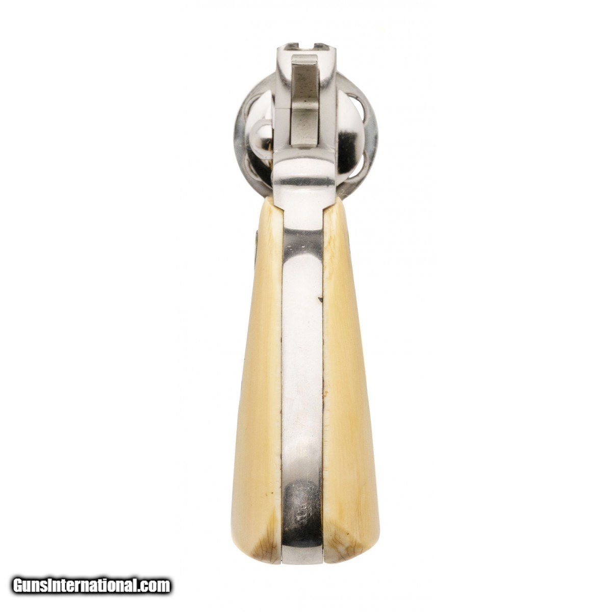 Description: " SN: 777212. Made in 1961. .38 Special with a 5"" barrel. Bore is in excellent condition. Colt double action scarce nickel plated revolver. Metal is in near excellent condition with minimal wear. Ivory Colt grips are in excellent condition. Overall condition is excellent. (Consignment) SOLD Curio/Relic: Yes |