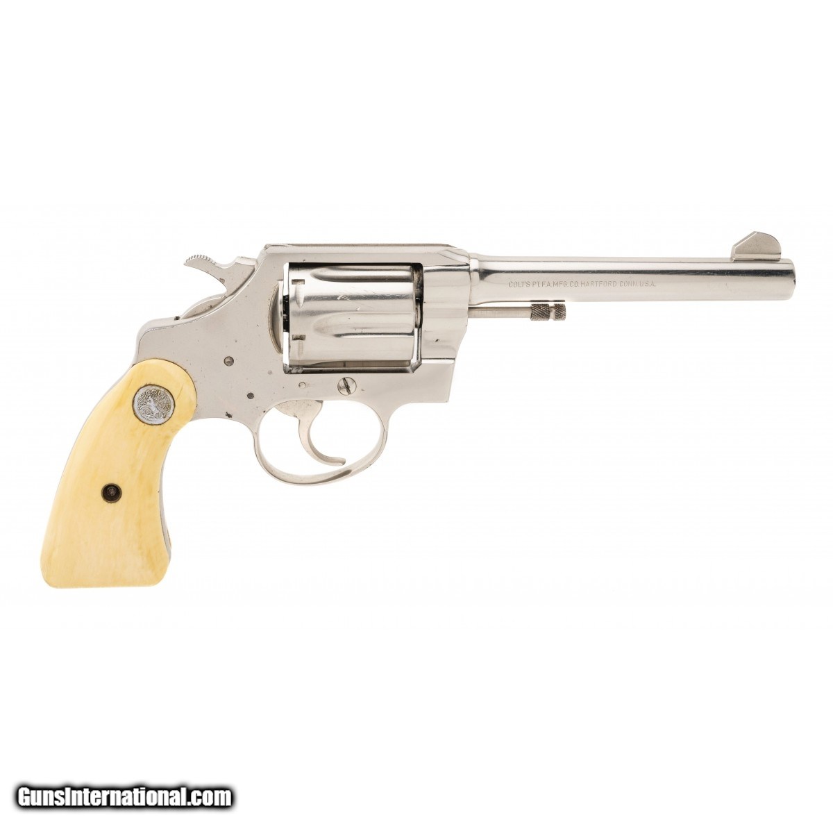 SN: 777212. Made in 1961. .38 Special with a 5"" barrel. Bore is in excellent condition. Colt double action scarce nickel plated revolver. Metal is in near excellent condition with minimal wear. Ivory Colt grips are in excellent condition. Overall condition is excellent. (Consignment)