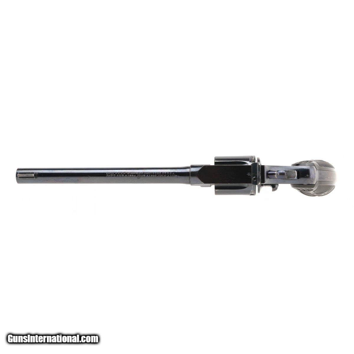 Description: " This first year of production (1910) Colt Police Positive Target revolver is known as the First Issue, Model ""G"". It is chambered for the 22 WRF caliber which is very scarce in this model. The 6"" barrel has an excellent bore with bright, strong rifling. The left side of the barrel is marked POLICE over POSITIVE (sharing the same P) followed by CAL. 22 W.R.F. and the last patent date on the top of the barrel is JULY 4, 1905. Note that this very early gun, serial number 1784, does not have the later TARGET marking on the barrel. The gun has approx. 95% bright Colt blue with loss on the grip straps. The edges of the hammer are bright blue and the sides are bright. The trigger is bright blue. The checkered hard rubber grips with oval COLT at the top are excellent with no chips or cracks. The action functions perfectly. This fine first year Colt Police Positive Target is ready for your collection. SOLD Curio/Relic: Yes |