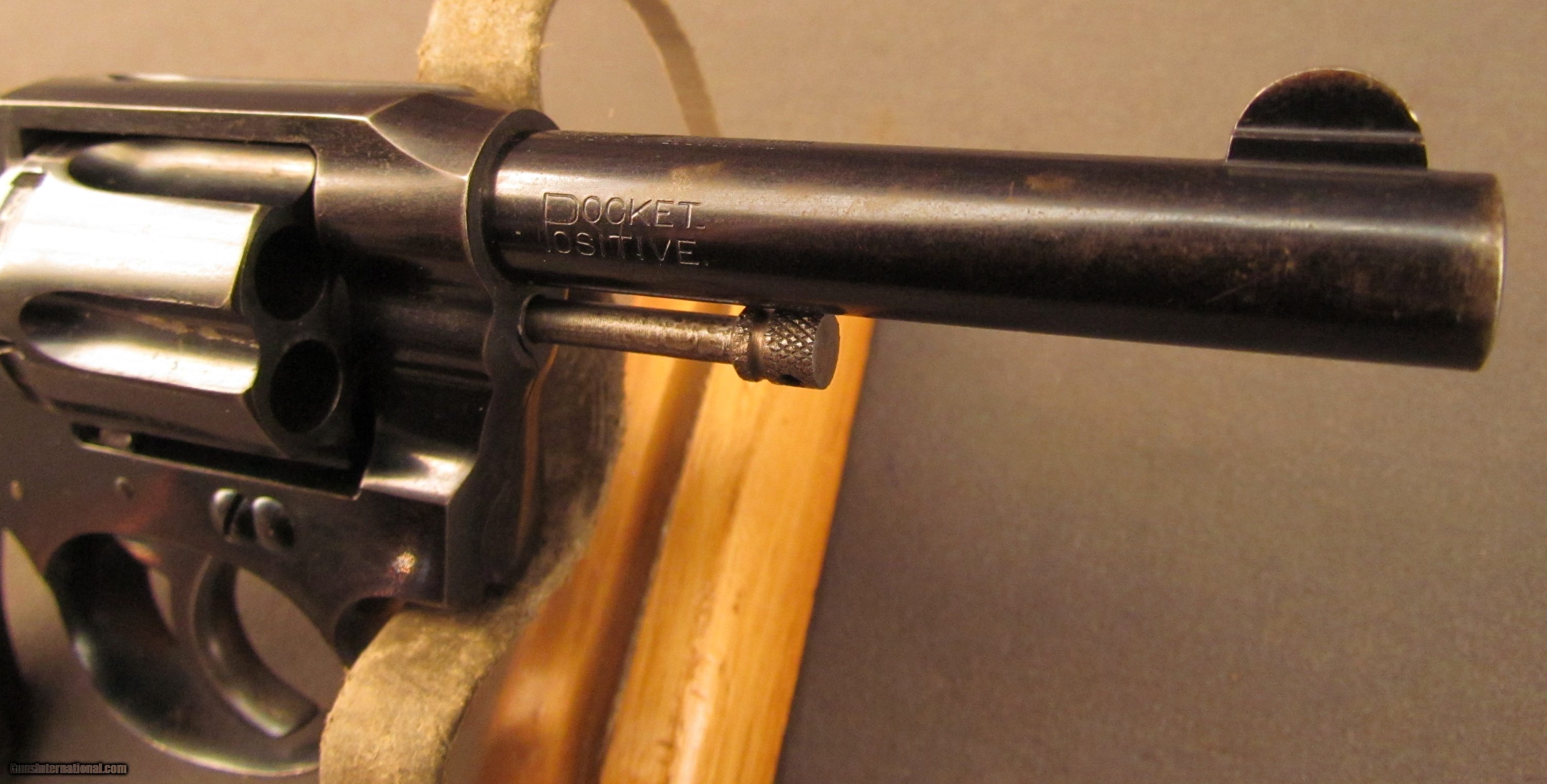 Description: Serial #40890, .32 Colt, 3 1/2" barrel with a fine, bright bore that has a few tiny spots of freckling within the grooves. This is a 1908-made revolver that has retained 90-95% of the original blue finish with some silvering along the high edges, and patches of mild freckling along the sides of the frame as well. The hammer and trigger retain a commensurate amount of original bright fire blue, and the original checkered hard rubber grips are in excellent shape with only some barely noticeable flattening of the points. The lock-up is tight and the revolver rates excellent condition overall. FFL or C&R SOLD Curio/Relic: Yes Manufacturer: Colt Model: Pocket Positive Serial Number: 40890 Caliber Info: .32 Colt Gauge Info: .32 Colt |