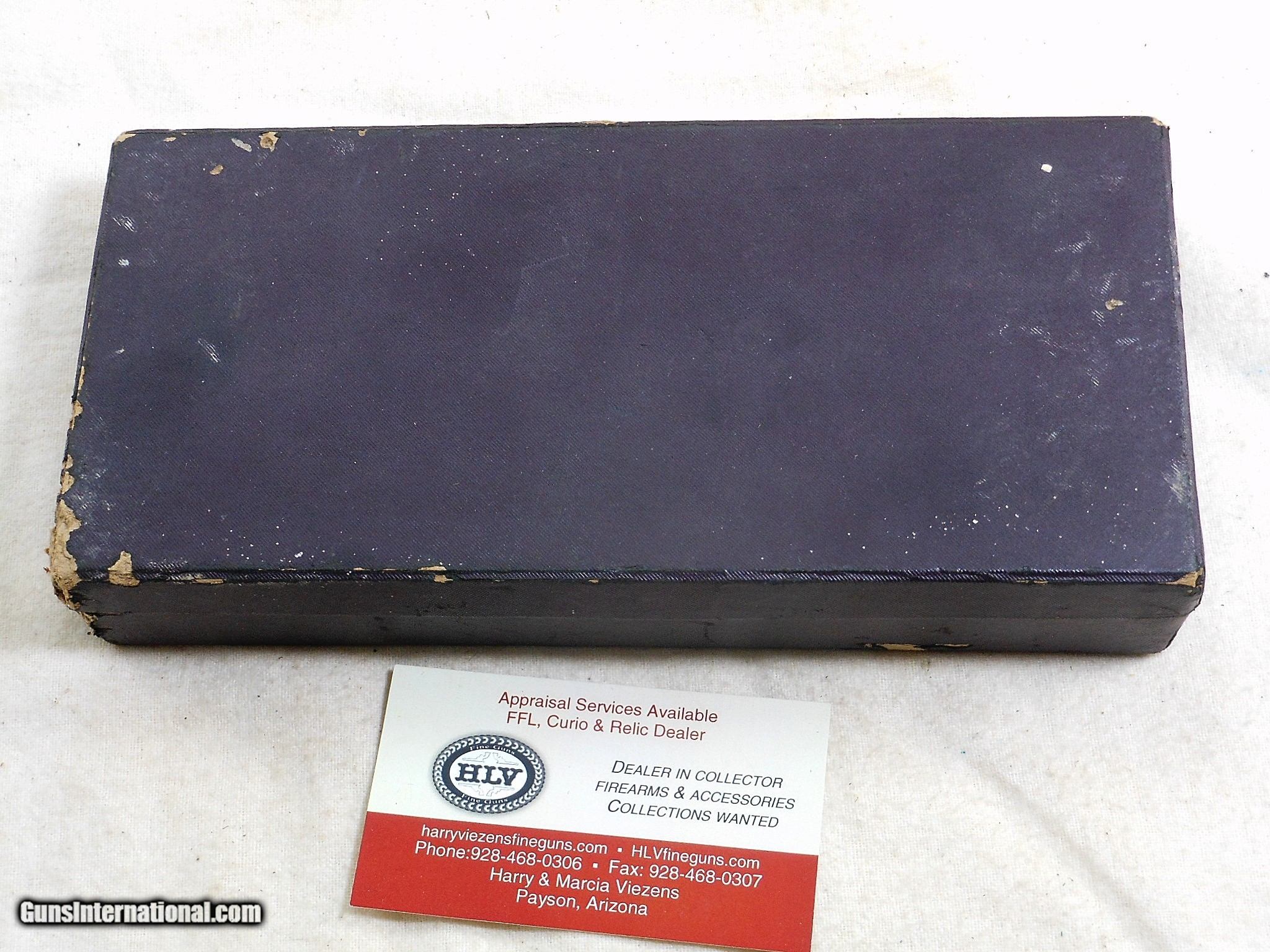 Description: This Colt was produced in 1935. The pistol's serial number is 370931. It has the standard 2 inch barrel chambered for the 38 New Police cartridge. This cartridge is interchangeable with the 38 Smith & Wesson cartridge. This Colt appears to be in unfired condition. The firing pin recoil plate shows no sign of shell wear. This Colt locks up tight as you would expect for a new pistol. The original bluing would rate a 99% or better condition. The grips would also rate the same. There is no drag marks on the cylinder stops. This is a truely stunning Bankers Special revolver in amazing condition! The original box is serial numbered to this pistol. The original cleaning brush is still in the box as well as the Shooting Suggestions Pamplet. The box is in pretty good condition and is sound. The label is in fair condition with some loss. These bankers special revolvers are very collectable especially when the pistol is in new condition and having the original box! This Colt is one of these fine pistols! Search for hlvfineguns on google for more details. Curio&Relic LOBE (M) (7) F. No. 561 -21 SOLD Curio/Relic: Yes Handgun Caliber: .38 S&W (.38 Colt New Police, .38 Super Police) Manufacturer: Colt Model: Bankers Special Serial Number: 370931 Barrel Length: 2 Inch Chambers: Minty Condition: 99% Overall Metal Condition: Very Fine Wood Condition: Very Fine Bore Condition: Minty Barrel Type: Snub Nose Action: Double Action Finish: Blued Sights: Standard Manufacture Date: 1935 Extras: Original Box And Accessories |