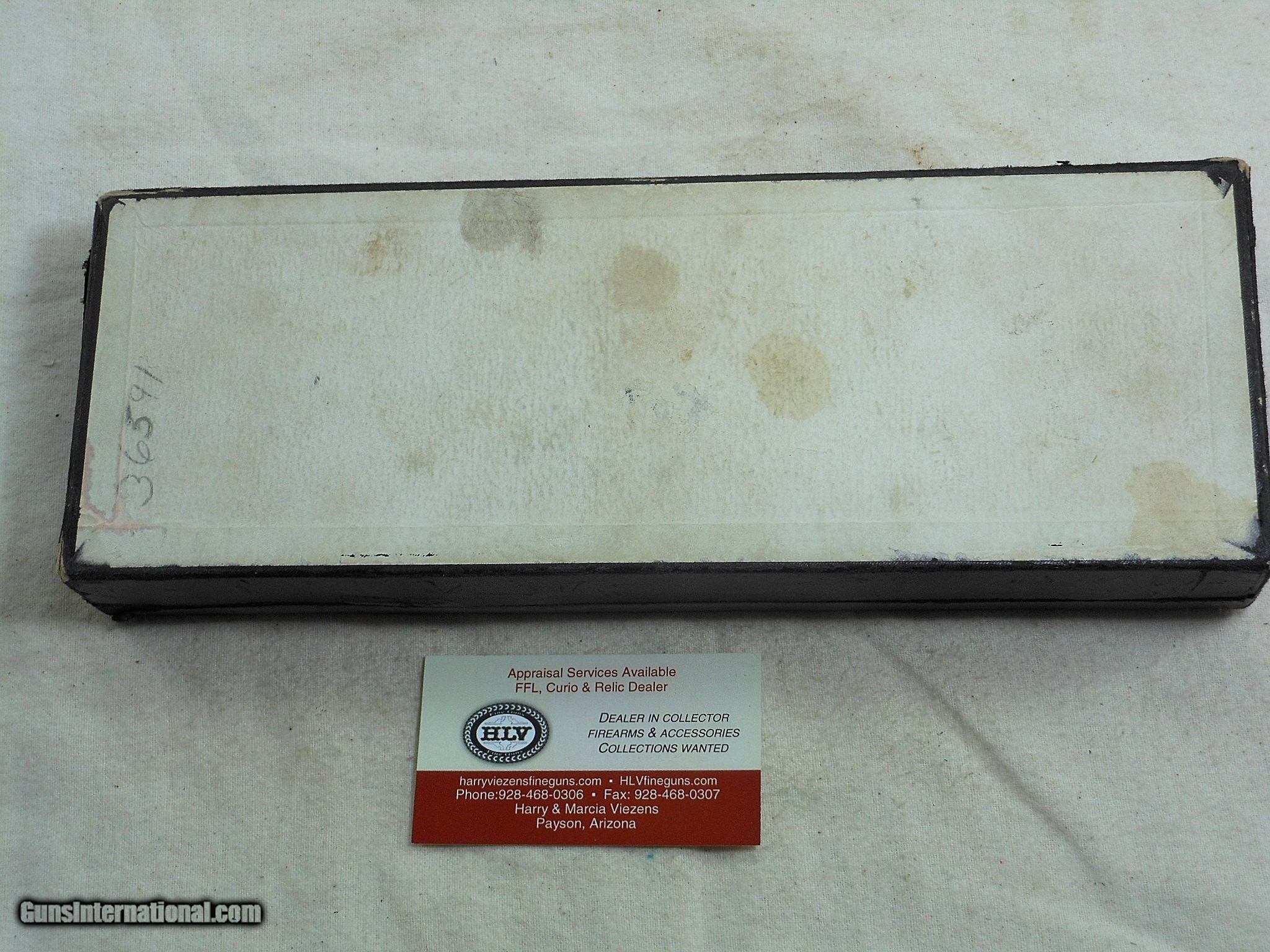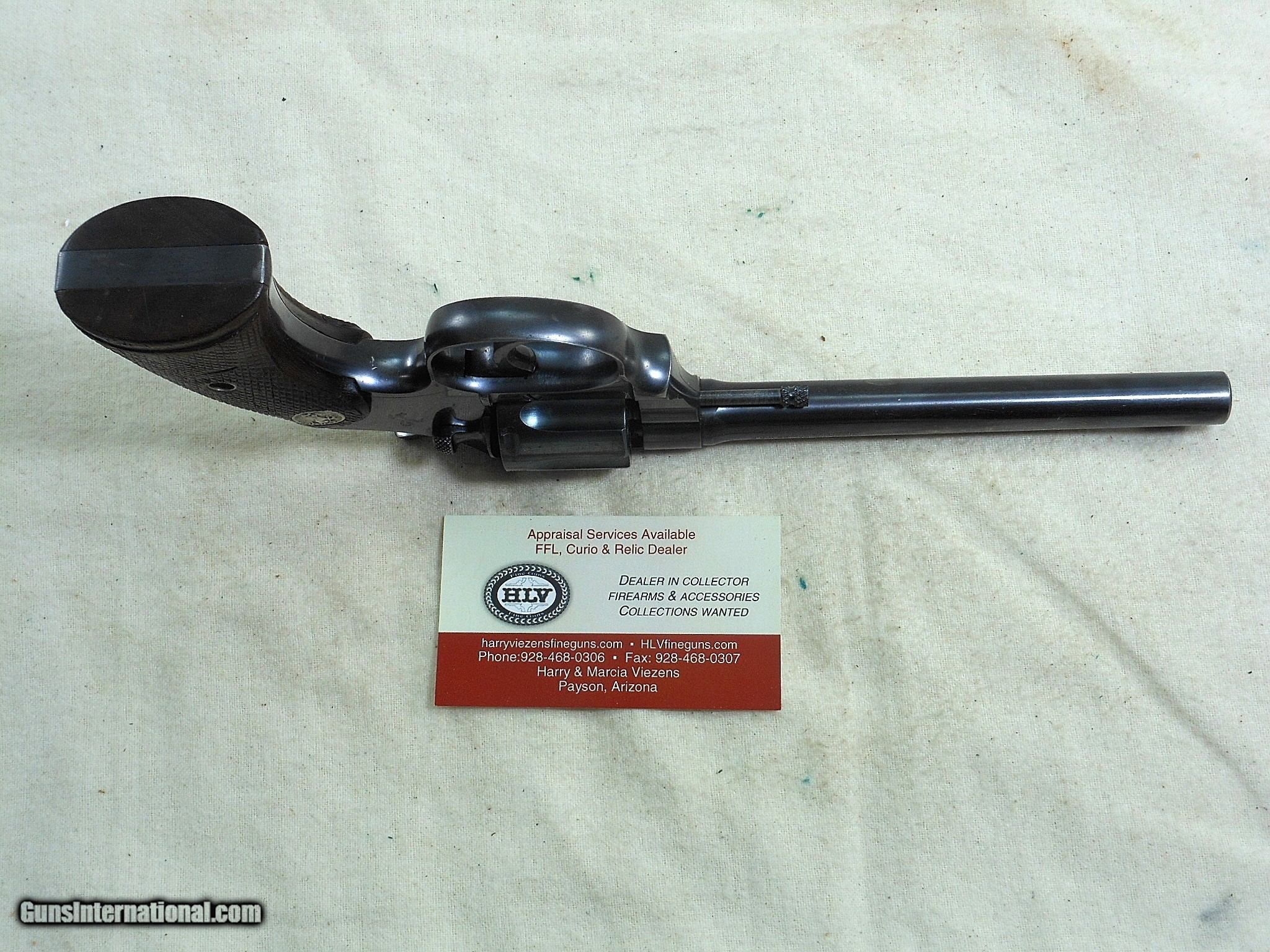 Description: SOLD This Colt was produced in 1929. The pistol's serial number is 36591. It has the 6 inch target barrel chambered for the rare 22 W.R.F. cartridge. The bore is in very fine condition. The chambers are also in fine condition. It has the original target sights intact. The action is in very fine condition with great timing. The grips are serial numbered to this Colt. The crane and cylinders lock up snug. The original bluing would rate a 96% overall condition. The wood grips wold rate a 90% overall condition with some checkering point wear. The original box is serial numbered to this Colt. It has the Special Instructions pamplet in the box. The box is in sound condition. The labels are fully intact. You very seldom see this 22 W.R.F. chambering in the target model Colt's. This Colt has seen some wear and use. There is no abuse or any alterations done on this pistol. This Colt is a pistol that you can still shoot and enjoy using without fear of value loss. As long as you take good care of it and keep it cleaned. Search For hlvfineguns,com on google for more details. Curio&Relic SOK (7) F. No. 561 -21 SOLD Curio/Relic: Yes Handgun Caliber: .22 WRF Manufacturer: Colt Model: Police Positive Target Serial Number: 36591 Barrel Length: 6 Inch Condition: 96% Overall Metal Condition: Very Good Wood Condition: Very Good Bore Condition: Very Fine Barrel Type: Target Action: Double Action Finish: Blued Sights: Standard Target Manufacture Date: 1929 Extras: Original Box And Accessories |
