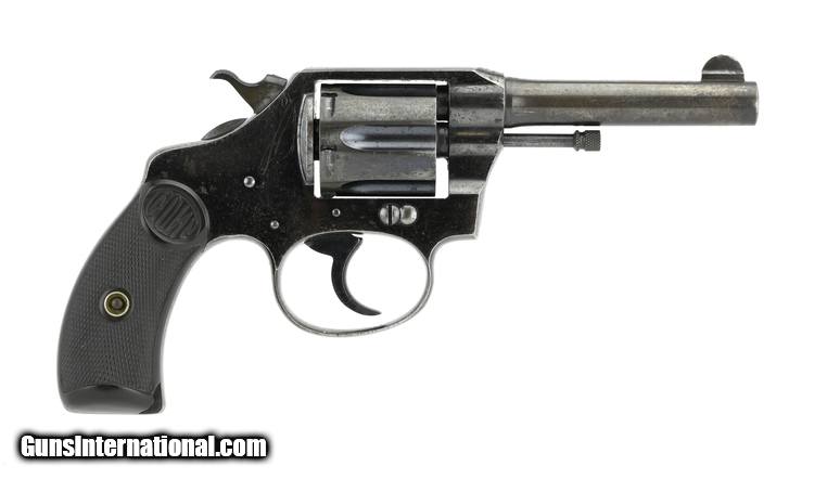 Colt Pocket Positive .32 police caliber revolver. Pre-War revolver with 3 ½” barrel. Made in 1914. Has about 80% thinning blue mixed with patina. Bore and action are excellent. The grips each have a small chip at the toe.