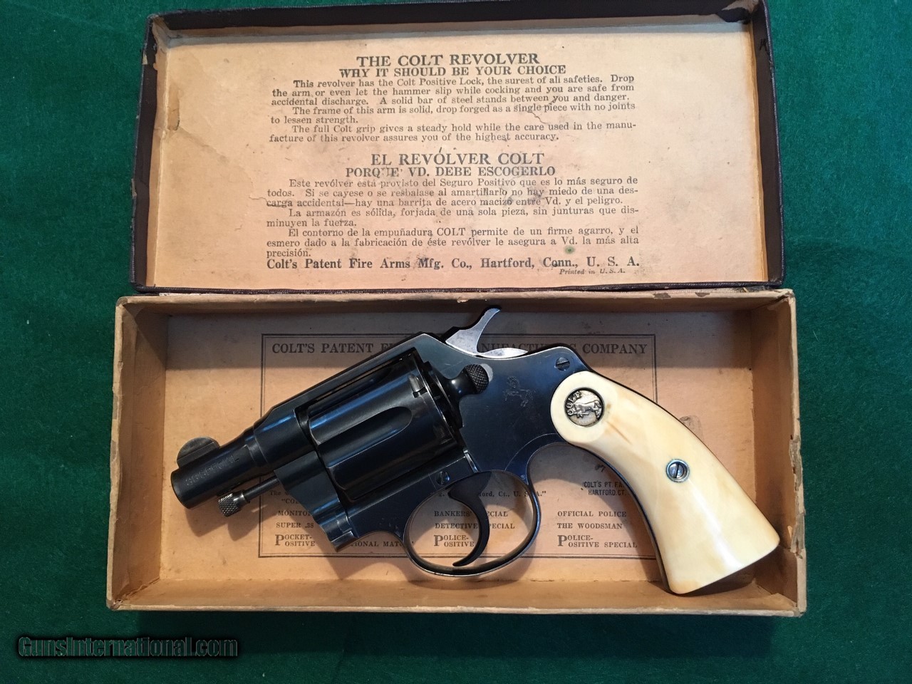 Description: Rare Colt Police Positive 2'' Blue Pre war 1927 dated Revolver. All Original and correct 2'' ,Factory letter ,Original finish in very nice condition, light wear , minty bore and cylinder. action is tight, Ivory grips with early deep dish medalions. Comes with original Box . The box is not numbered, no number on the box but has the correct lable. These 2'' Police Positives were only made for about 2 years 1926 and 1927, so are very hard to find in any condition. A very nice piece to add to a snubby collection. Call with any questions or offers, Tom 612 859 5673 SOLD Curio/Relic: Yes |
