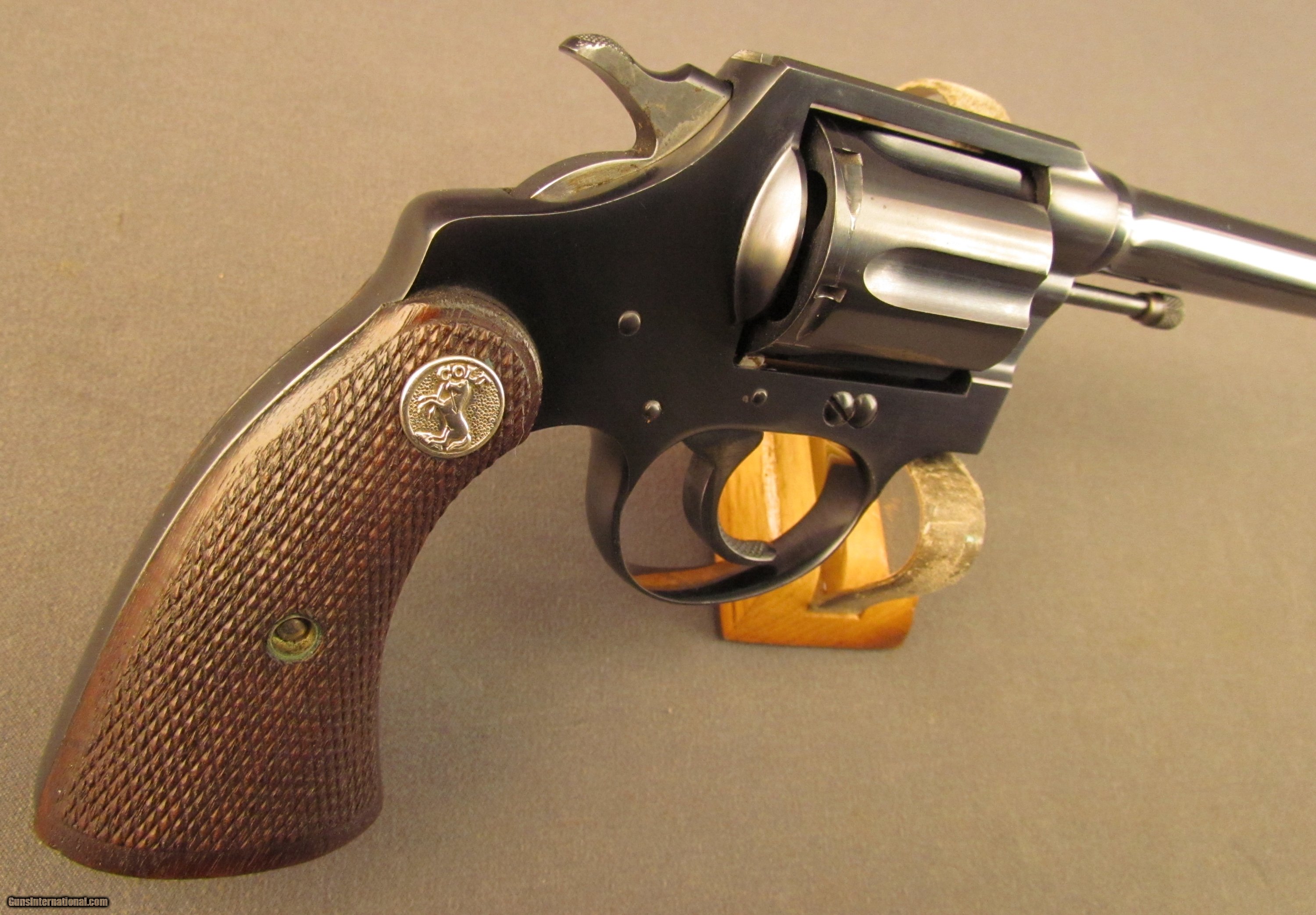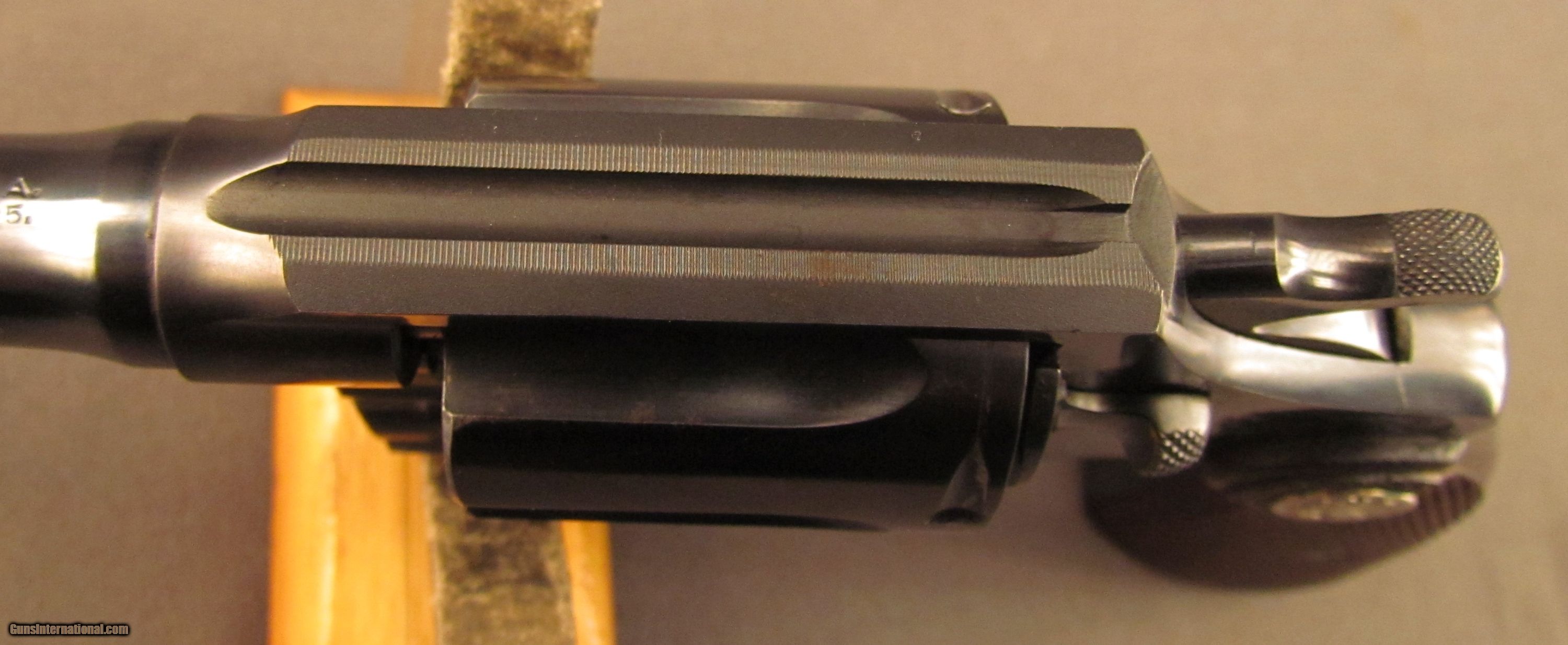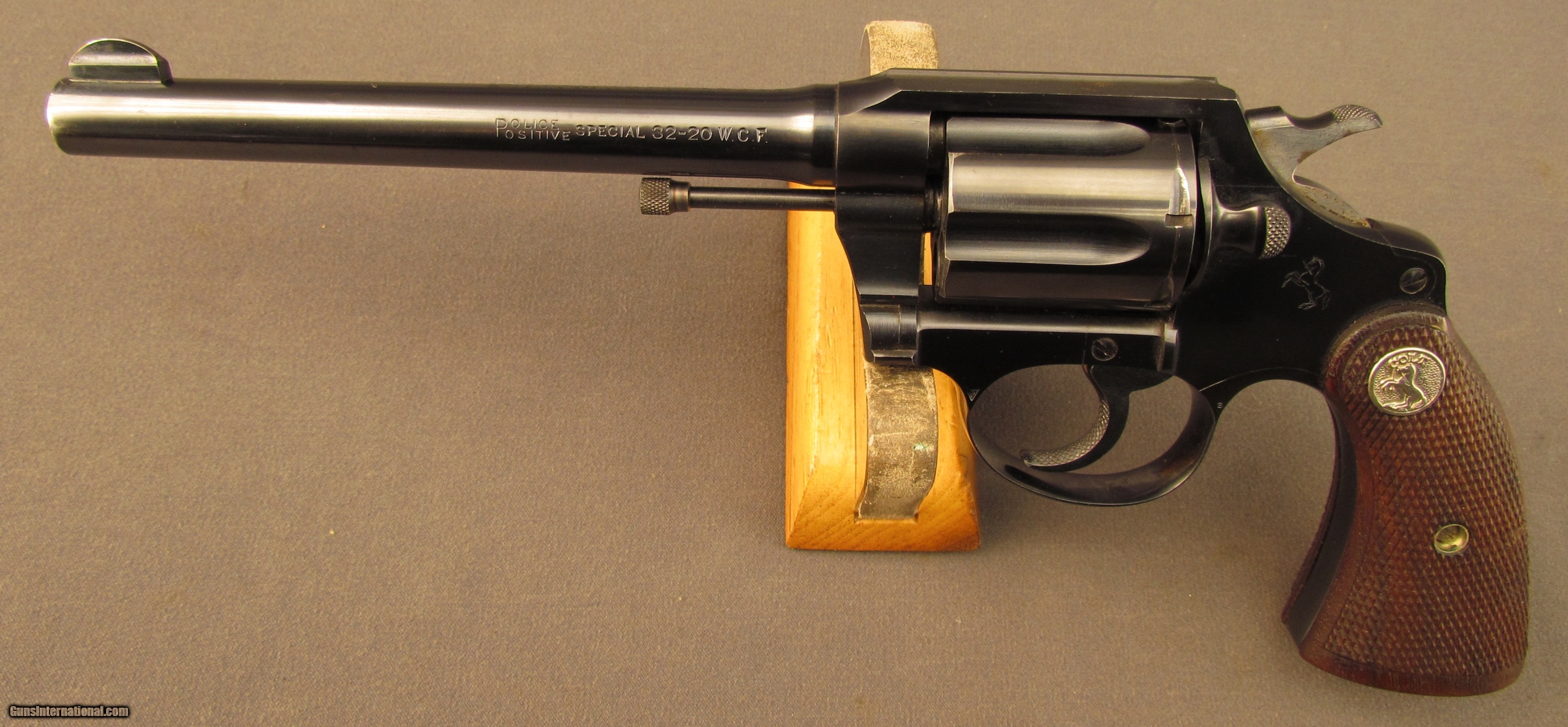 Description: Serial # 401007, .32-20, 6” barrel with an excellent, bright bore. This is a handsome 2nd Issue revolver, made in 1931, with an earlier, 1st Issue barrel (1905 patent date) that retains about 98% original brilliant Colt blue throughout. The barrel was used until 1926, but may have been pulled from the bin at the factory as a left over when this gun was built. There is some mild silvering along the high edges, a few minor impact marks on the top of the barrel, and a light turn-ring on the cylinder. Some further minor freckling is present within the cylinder flutes, and along the gripstraps. The checkered walnut Colt medallion grips are in excellent shape with only a a few negligible marks along the butt, and very little flattening of the points. The action is tight and functions flawlessly. This is a truly nice revolver, chambered in a great and useful caliber. FFL or C&R SOLD Curio/Relic: Yes Manufacturer: Colt Model: Police Positive Caliber Info: .32-20 Gauge Info: .32-20 |