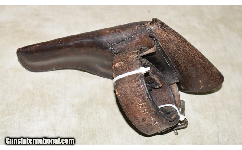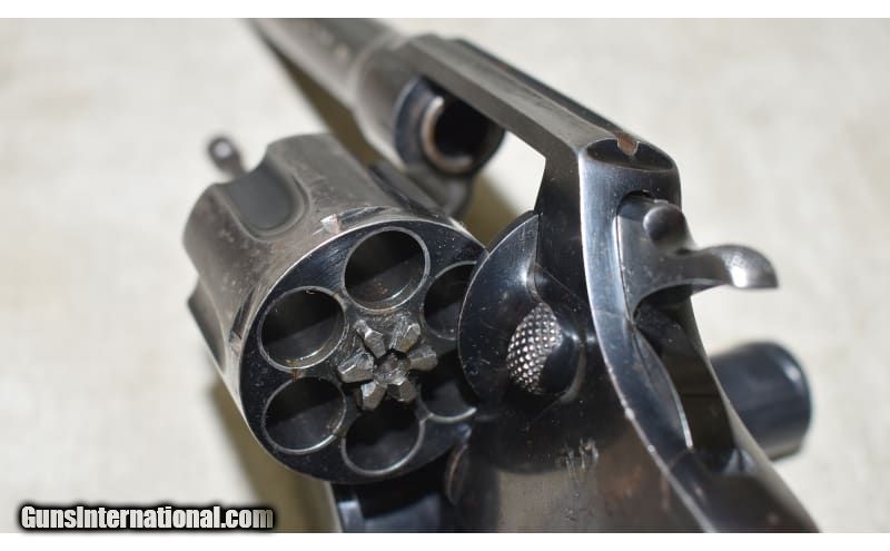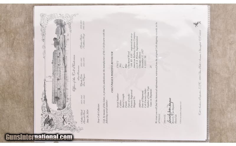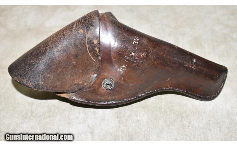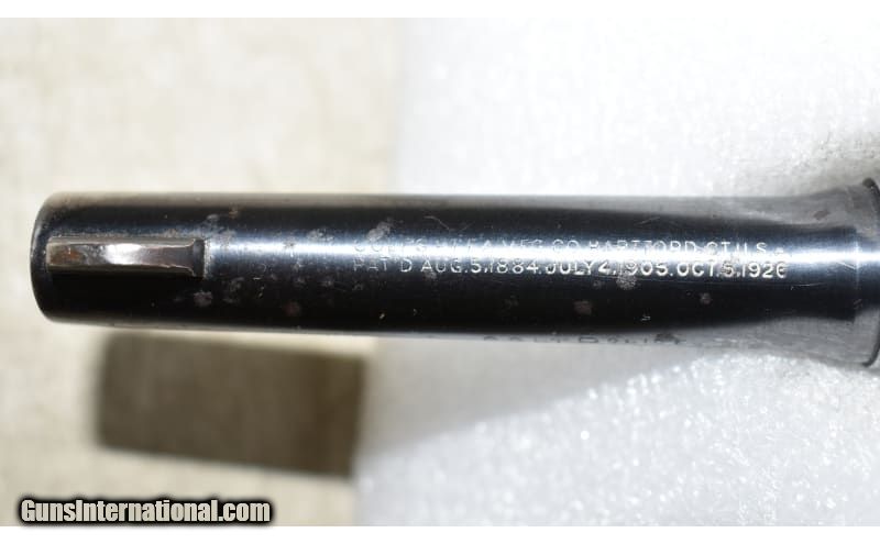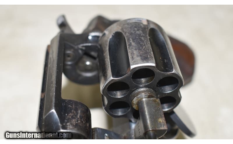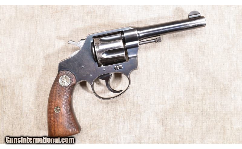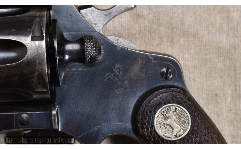 Description: These Colt pistols were carried by Railway Express couriers. Railway Express was a Company formed by combining several independent agencies, with the purpose of simplifying transport of goods in WWI. It operated on the railways in a similar manner to FedEx operating in the air today. The couriers were armed to protect the high value packages they were contracted to deliver. .38 S&W Special SOLD Chambers: 6 rounds Metal Condition: "Fair. These service pistols were carried, a lot. About 50% of the blue remains. There also a large number of scratches, and some pitting. Wood Condition: Fair. There is quite a bit of wear on the checkering and on the Colt medallion. The bottom of the butt has a number of dings and what may be a repaired chip. Bore Condition: "The bore is a little bit dark but shiny and clean, the rifling is a little thin but okay. Barrels: 4 inches Triggers: Factory double and single action trigger. Butt Pad: Slim profile walnut Weight: 21 Ounces Sights: Blade and groove. Item Location: Rogers |