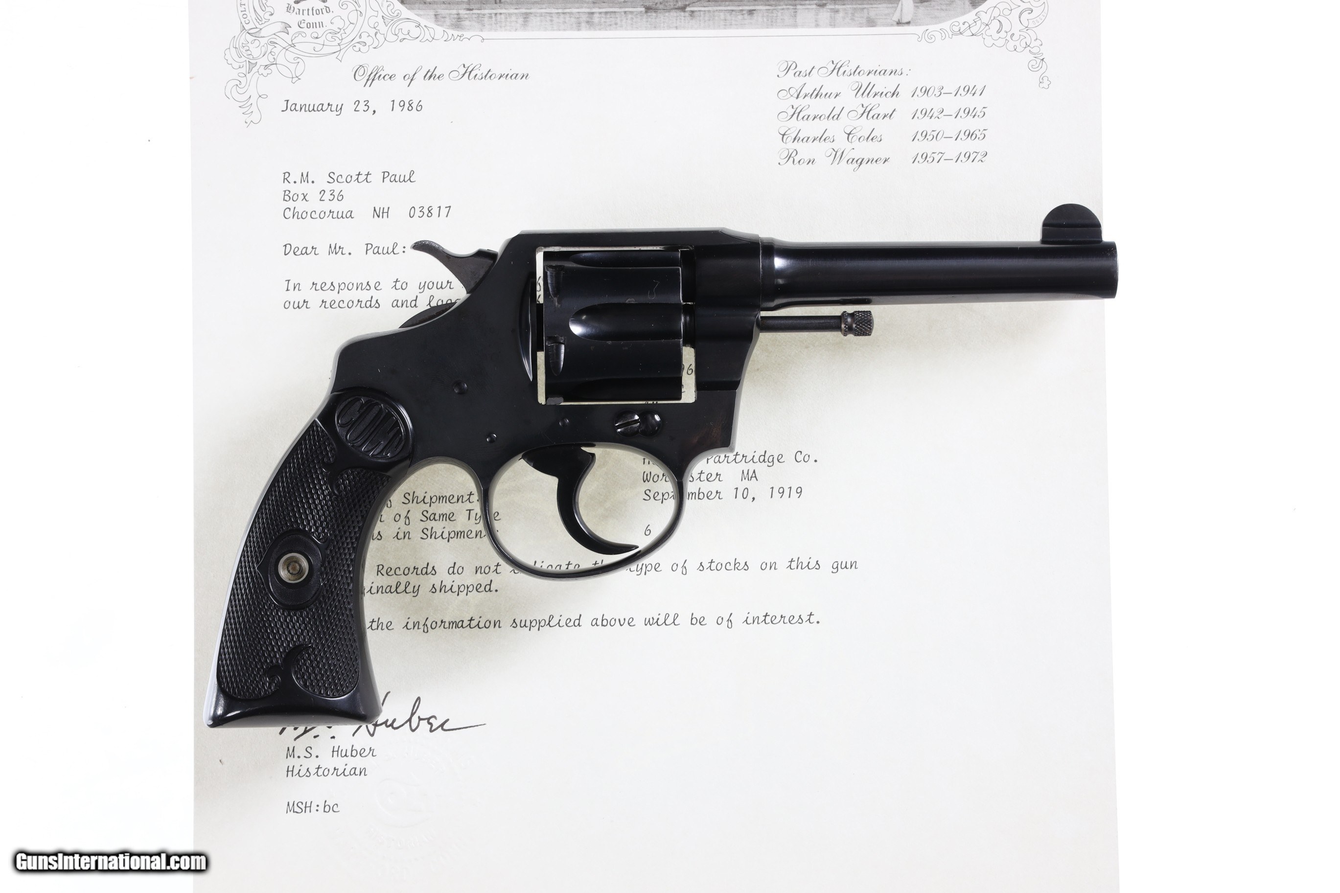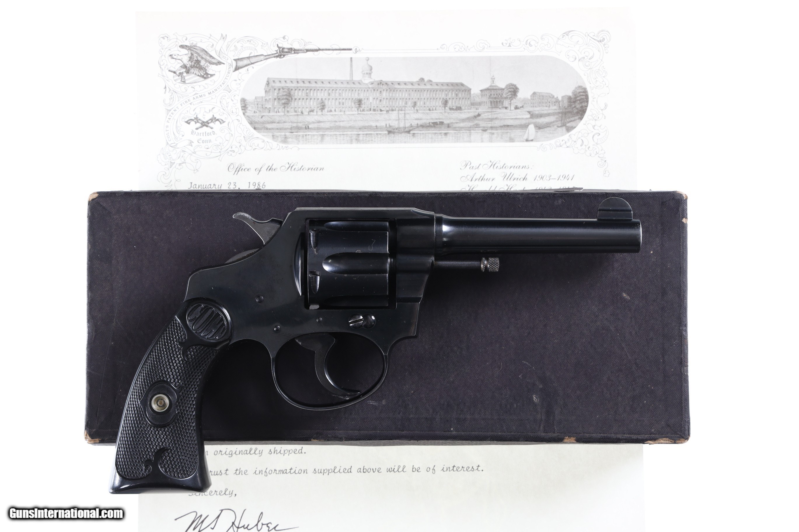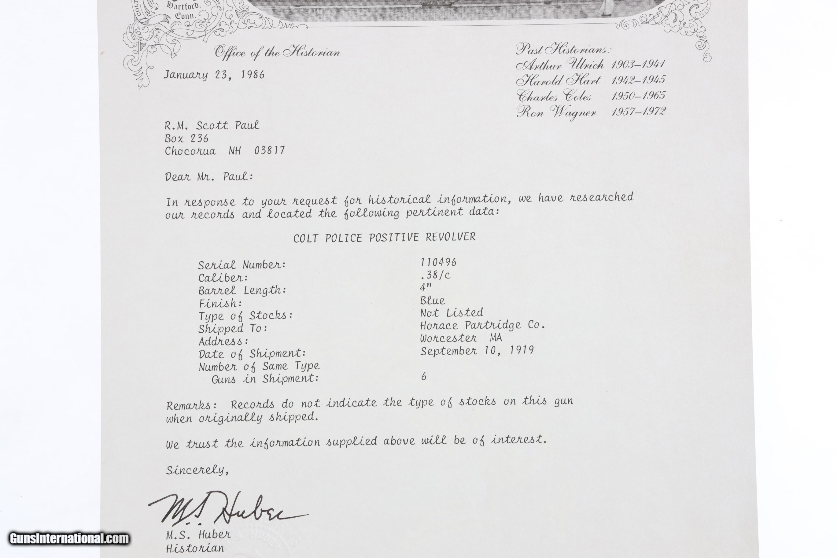 Description: Factory letter states a ship date of September 10, 1919, to Horace Partridge Co. in Worcester, MA, in .38 caliber with a 4" barrel and blue finish. With non-matching Colt Police Positive box. Exceptionally fine retaining 98% factory blue finish with a touch of edgewear at high points and heel from box, grips are near perfect, a couple of small impressions exist on butt believed to be from cleaning rod in box, all markings and legends are crisp, factory hang tang is slightly soiled, box remains fine with excellent label, factory letter remains as issued, mechanically excellent. • Free Shipping, No Credit Card Fees. • Lay-a-way available for this firearm. • 1/3 Down, a 1/3 in 30 Days 1/3 in 60 Days. SOLD Curio/Relic: Yes Handgun Caliber: .38 Manufacturer: Colt Model: Police Positive Serial Number: 110496 Barrel Length: 4 |