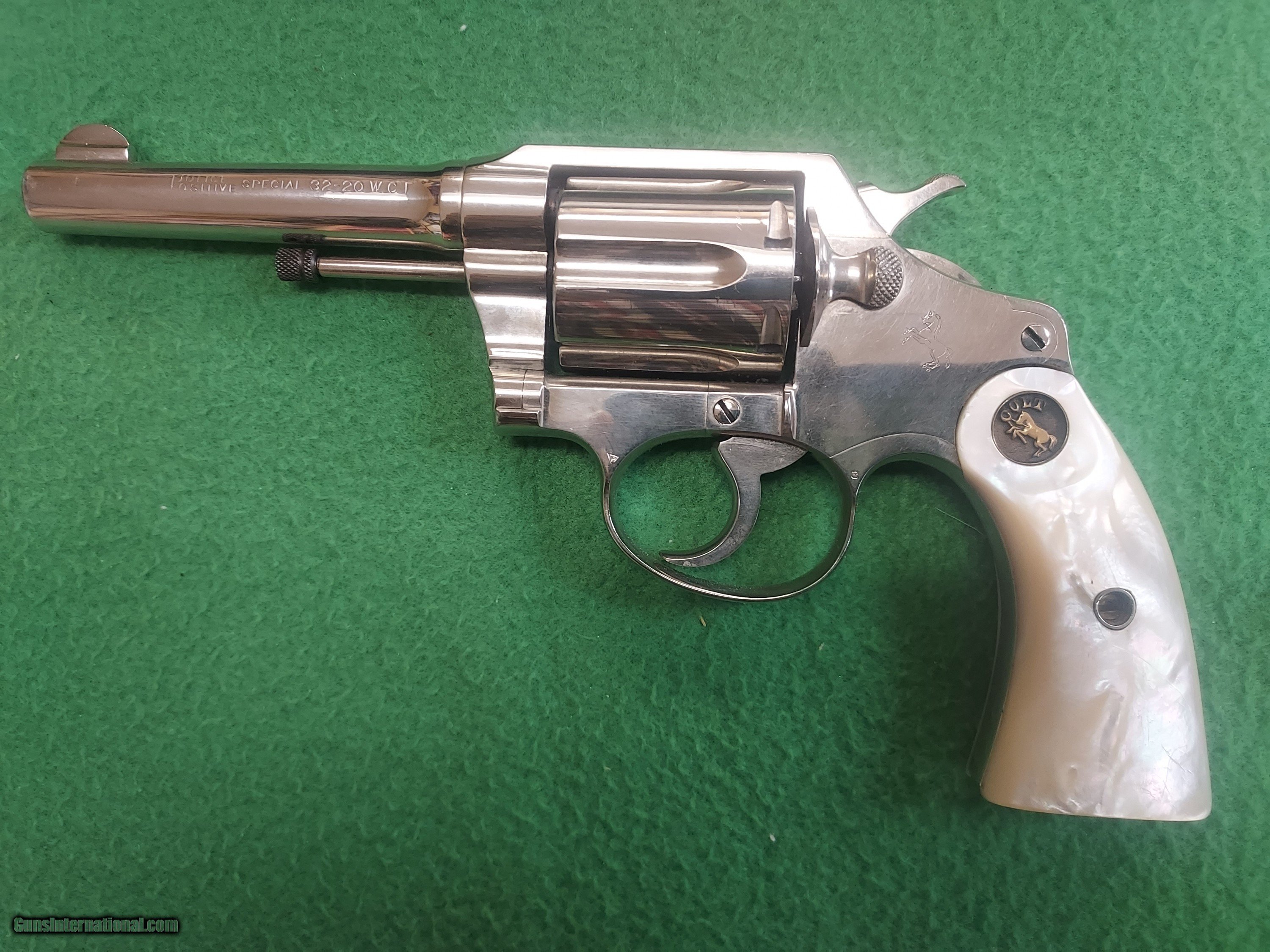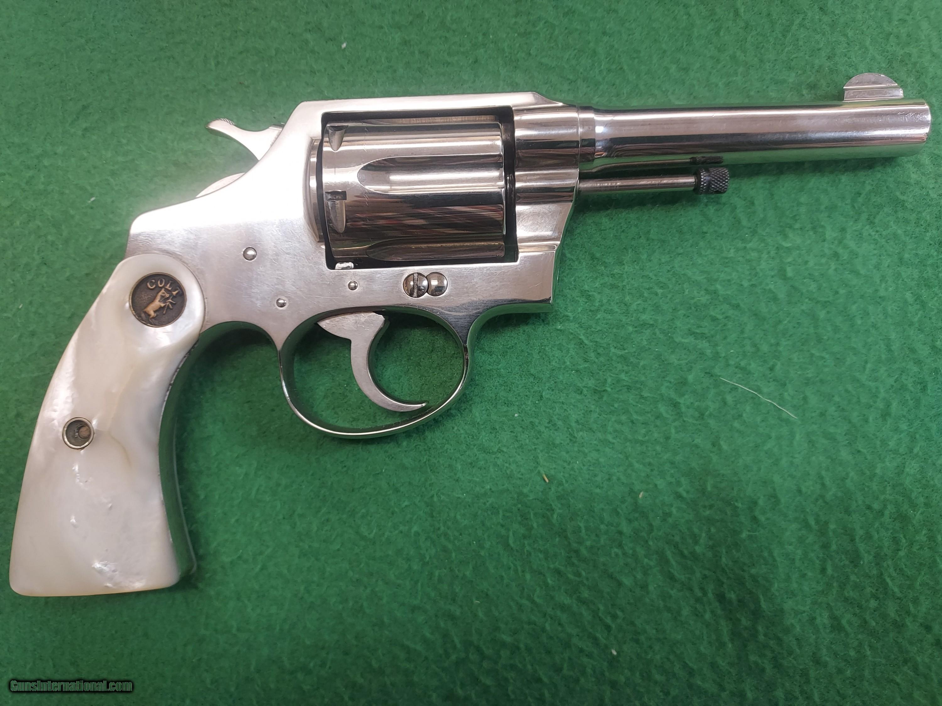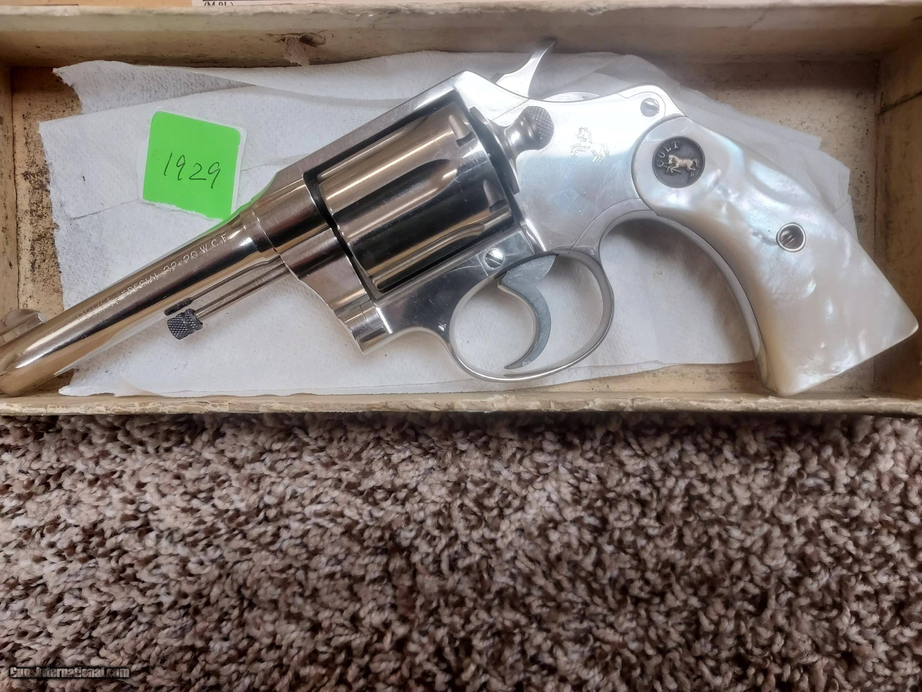 Description: Offered for sale is a used prewar Colt Police Positive Special Revolver, 32-20 WCF, with factory nickel finish with Pearl grips. Serial Number 307216, Made in 1929, This was a special-order gun, the finish is 100% original nickel, and the grips are original factory Pearls. The gun is in real nice shape, as showned in pictures. The box is not the correct box it is for a blue gun. If you need more information or photos, please contact us. These are consignment firearms, and the owner receives the funds, so check or money order is preferred. We are an FFL Dealer so please be aware of your Federal & State laws before buying. Buyer pays exact shipping & insurance cost for shipment of firearm. SOLD Handgun Caliber: .32-20 Winchester (.32 WCF, .32-20 Marlin, .32 Colt Lightning ) Manufacturer: Colt Model: Police Positive Serial Number: 307216 Barrel Length: 3 |