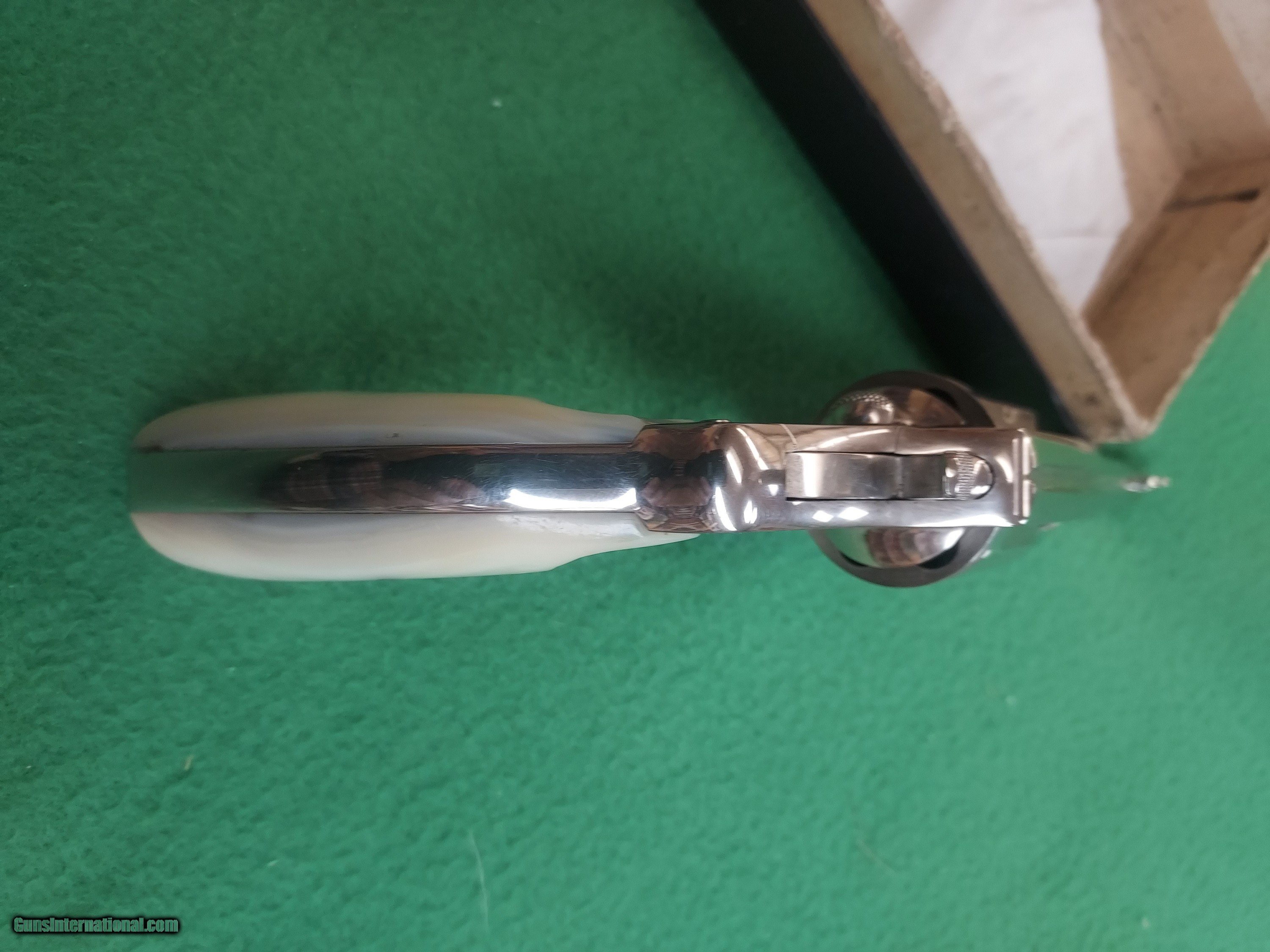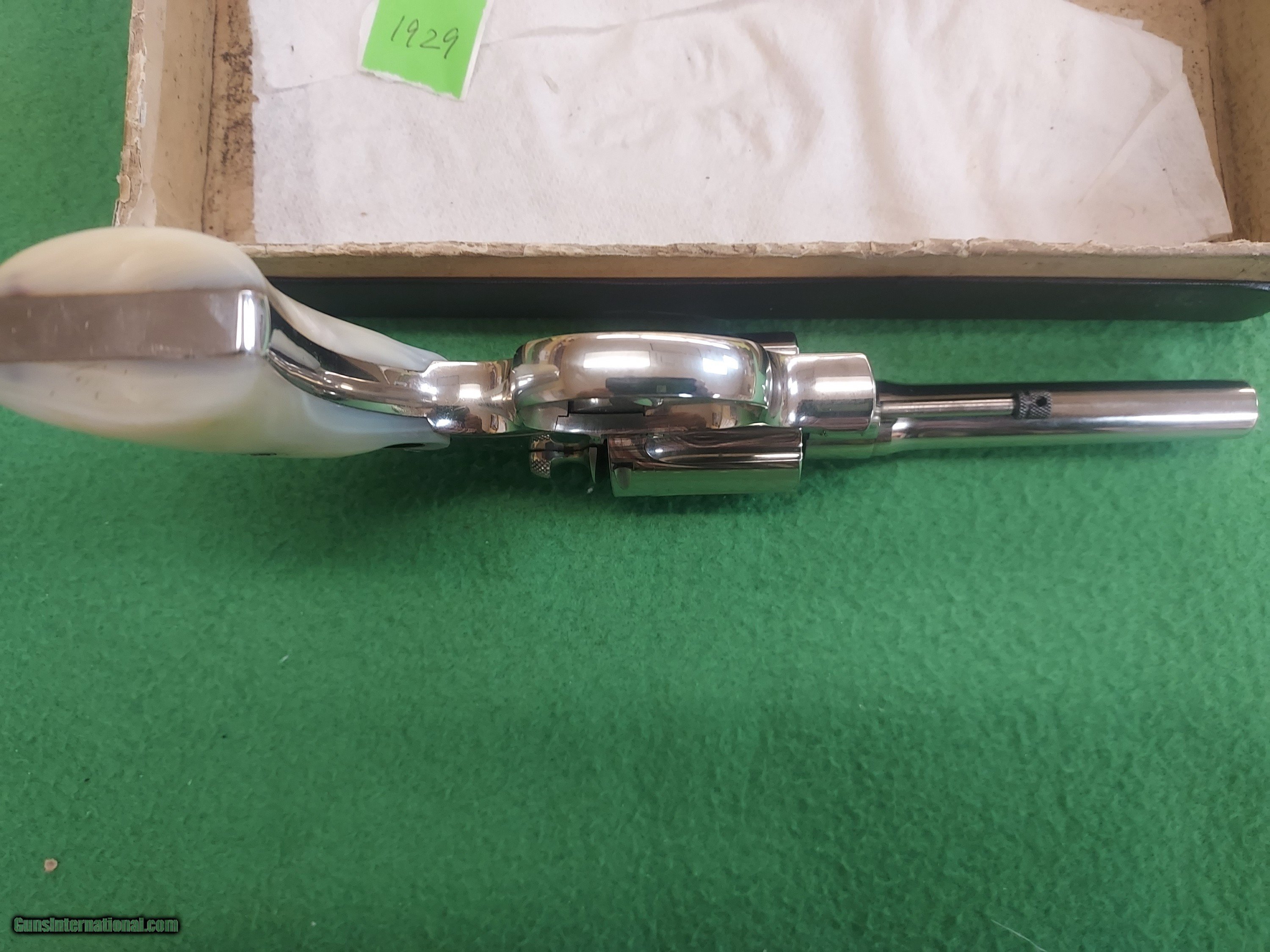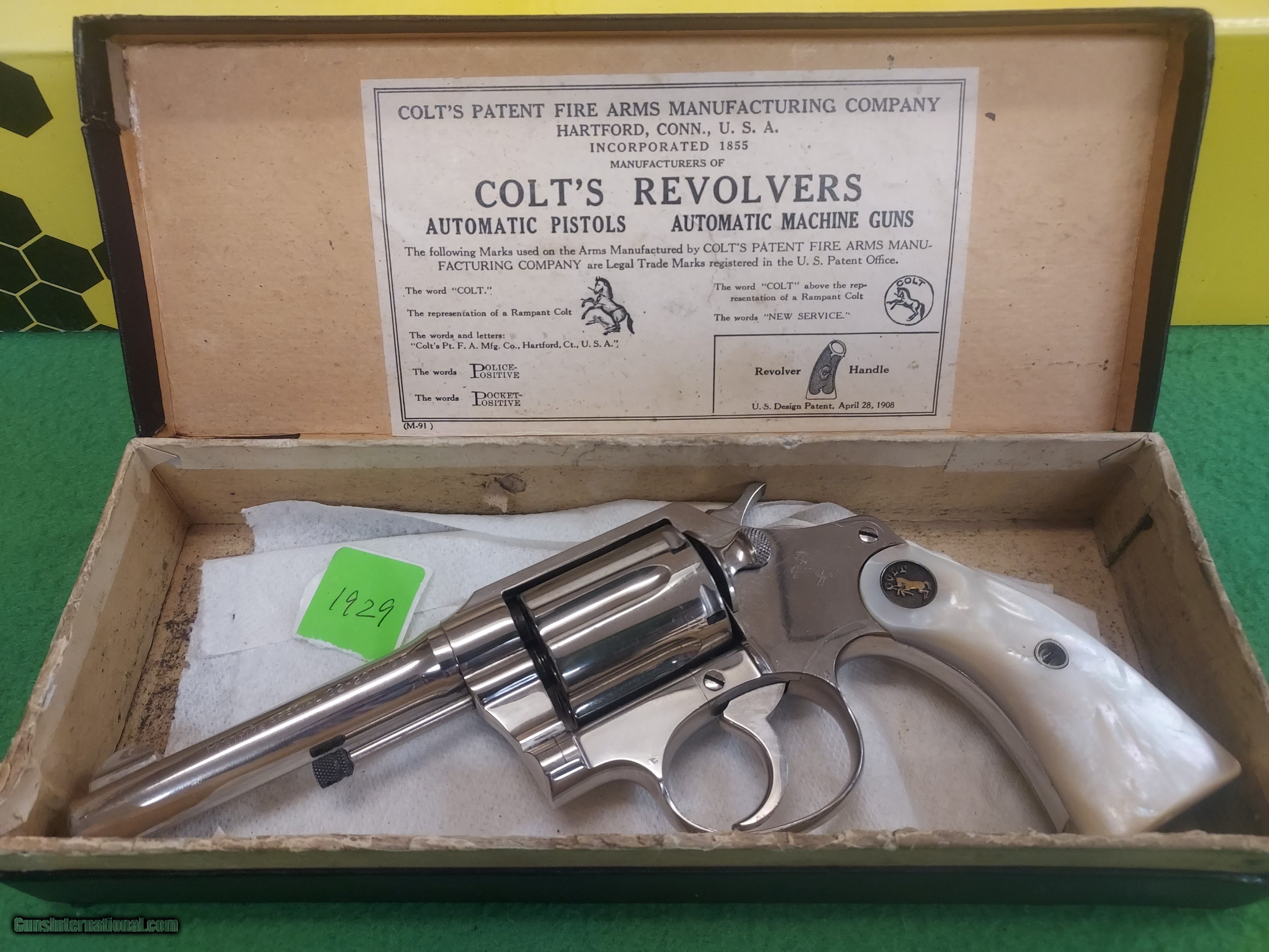 Description: Offered for sale is a used prewar Colt Police Positive Special Revolver, 32-20 WCF, with factory nickel finish with Pearl grips. Serial Number 307216, Made in 1929, This was a special-order gun, the finish is 100% original nickel, and the grips are original factory Pearls. The gun is in real nice shape, as showned in pictures. The box is not the correct box it is for a blue gun. If you need more information or photos, please contact us. These are consignment firearms, and the owner receives the funds, so check or money order is preferred. We are an FFL Dealer so please be aware of your Federal & State laws before buying. Buyer pays exact shipping & insurance cost for shipment of firearm. SOLD Handgun Caliber: .32-20 Winchester (.32 WCF, .32-20 Marlin, .32 Colt Lightning ) Manufacturer: Colt Model: Police Positive Serial Number: 307216 Barrel Length: 3 |