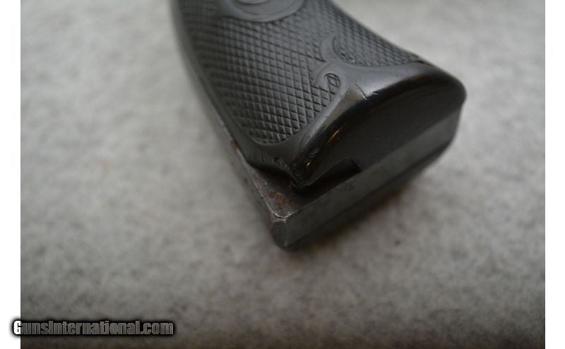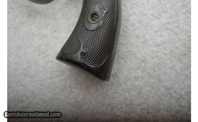 Description: Shooter grade for certain. There is solid evidence that this example has been reblued at least once. There is pitting that has been blued and most of the markings are very faded. Despite the refinish the area around the muzzle shows significant finish loss with the front edge of the cylinder starting to thin out as well. Grips are in bad shape with thinned texturing and damage. Sources indicate this example was built in 1914 and is of the first issue of the model. .32-20 WCF SOLD Chambers: 6-Shot revolving cylinder. Metal Condition: Fair. Wood Condition: Grips are in poor to fair condition. Bore Condition: Fair to good. Rifling can be easily seen but there is pitting in the lands/grooves and the bore is getting dark. Barrels: 4" Blued. Triggers: Blued metal with smooth surface. DA/SA Stock Dimensions: N/A Fore End: N/A Butt Pad: Hard black rubber grip panels. Weight: 1lb 8oz Sights: Fixed front blade and groove on the top of the frame. Chokes: N/A Item Location: Green Bay |