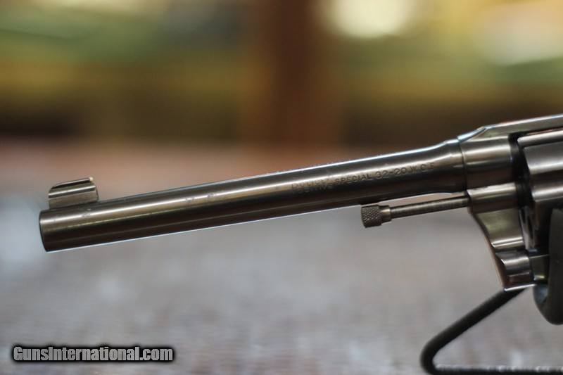 Description: 6 " barrel 90 % original charcoal bluing Hard rubber Colt grips. Perfect bore & chambers 1st model Police Positive Special Longer frame to house long cylinder. Hard to find gun in best Caliber available 32-20. Manufactured 1907-1927 $ 629 all personal checks take 3-5 days to clear SOLD |
