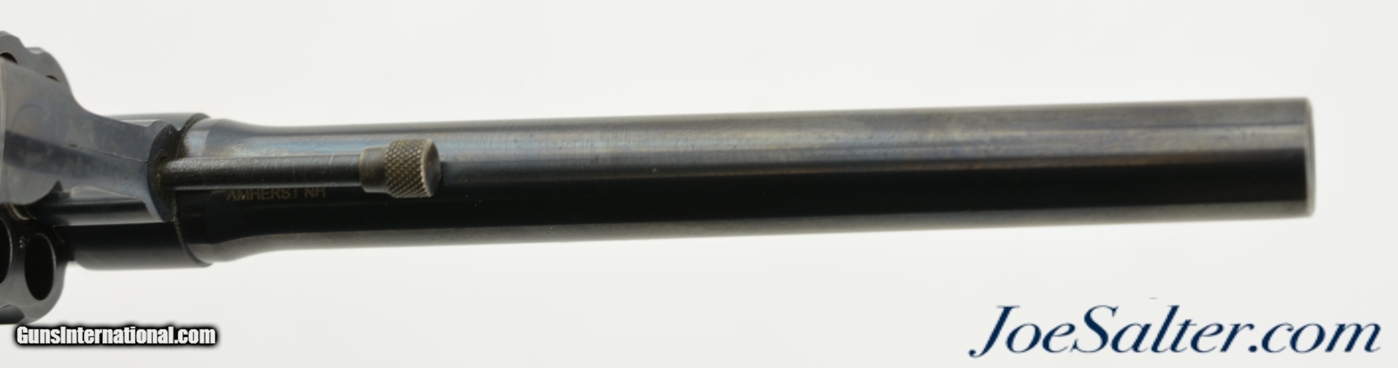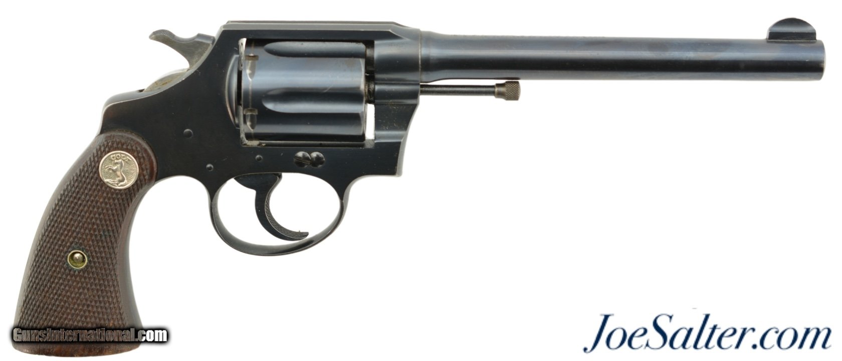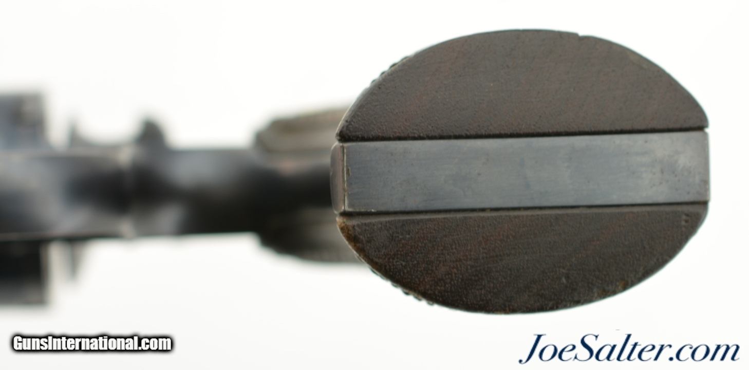 Description: Serial 391032, .32-20 (.32 WCF), 6" barrel with an excellent, bright bore. This is a 1930-made revolver that has retained 90-92% of the original blue finish, with some mild silvering ay the muzzle, along the high and exposed edges, as well as a light turn-ring on the rear of the cylinder. Additionally, there is a small spot of ruddy-brown surface oxidation near one of the chamber mouths, some very mild freckling on the sides of the hammer spur. There is an unobtrusive import mark on the underside of the barrel . The checkered walnut Colt medallion grips are in fine shape with some minor handling marks and some flattening of the points. The lock-up is tight and the revolver is fully functional. This is a very good plus .32-20 Police Positive Special overall. FFL or C&R; SOLD Curio/Relic: Yes |