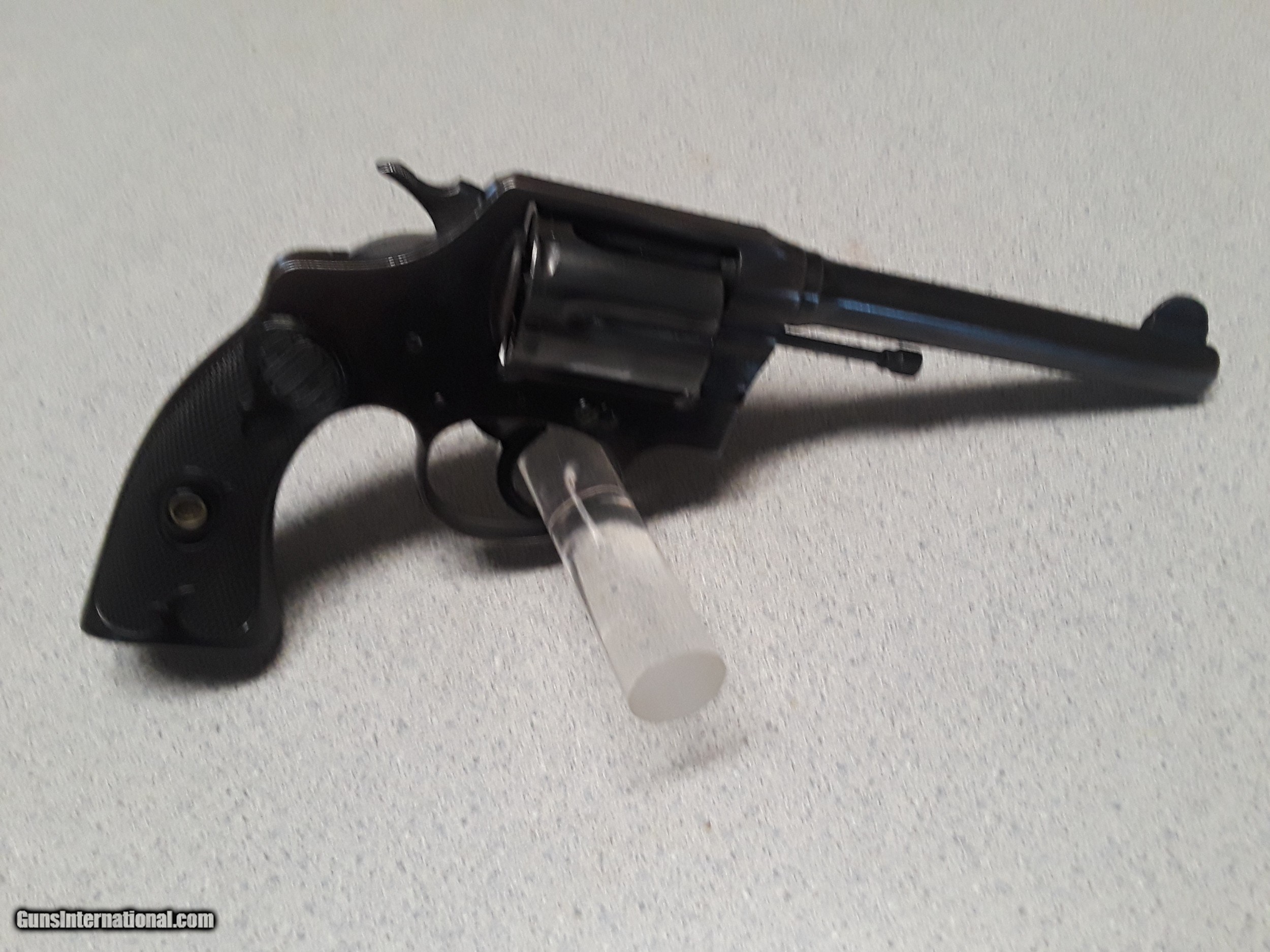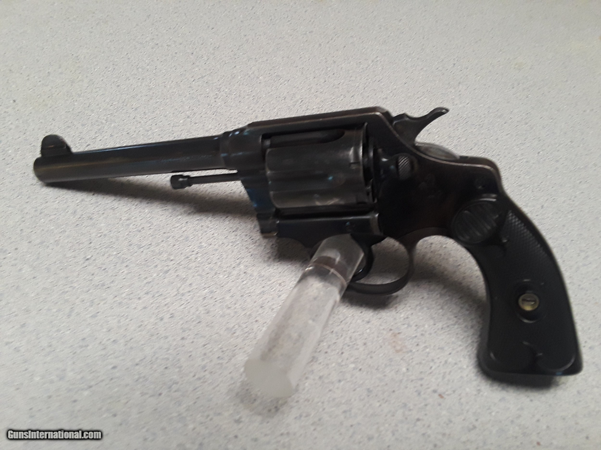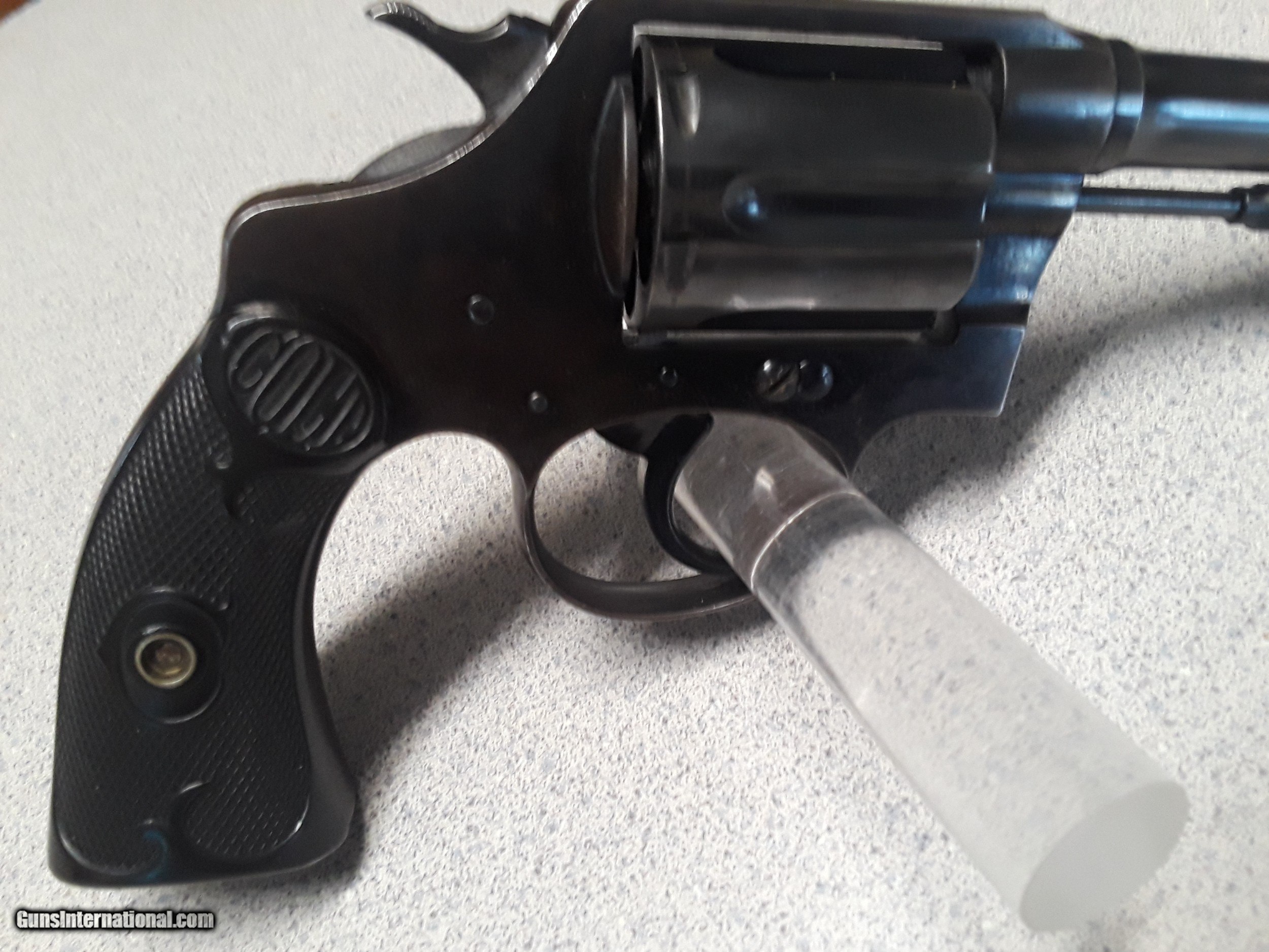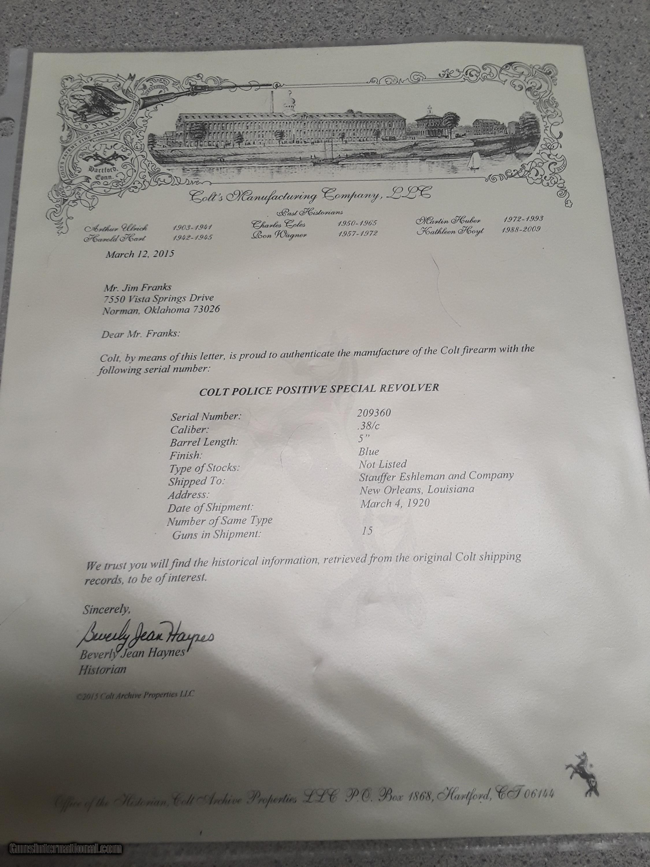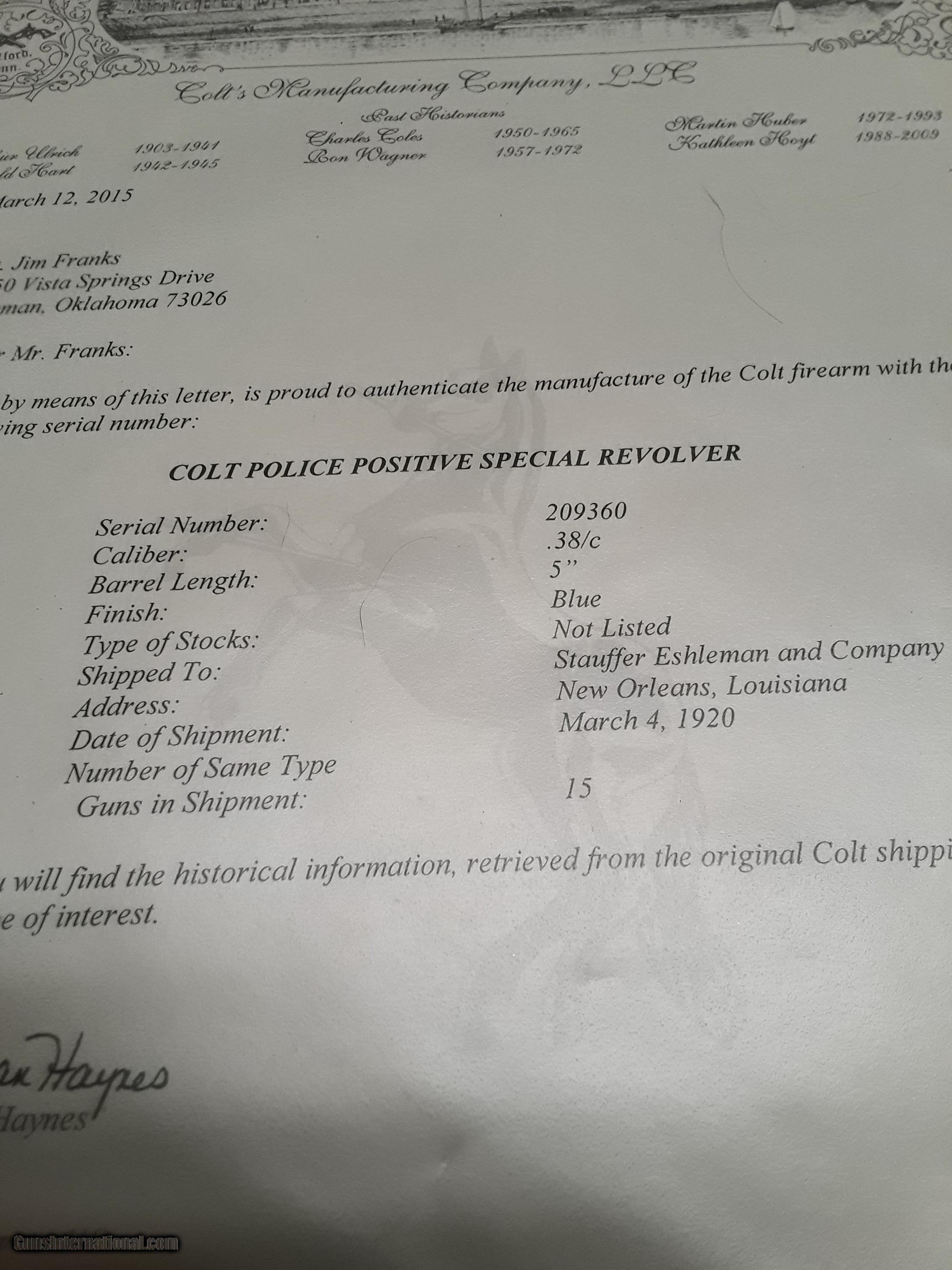 Description: The item for sale is a Colt Police Positive Special Revolver. This is the first issue of this model which ran from introduction in 1907 to 1927. There were four issues of this model with production ending in 1995. The overall condition of the revolver is very good. The Colt factory letter,, included with the sale of this revolver, states it was shipped March 4, 1920 to Stauffer Eshleman and Compsny of New Orleans, Louisiana. The revolver appears to have seen little use. The blue is very good showing minimal wear. There is some dulling of the blue on the back-strap and butt. The grips are excellent. Virtually no wear ring on the cylinder. The action is mechanically excellent. The bore is very good. The grips are excellent without cracks or chips and showing virtually no wear. Please include $35 to cover shipping and insurance. A copy of a FFL or C&R is required prior to shipping. This will be shipped via USPS and fully insured. SOLD Curio/Relic: Yes Handgun Caliber: .38 Special Manufacturer: Colt Model: Police Positive Special Revolver Serial Number: 209360 Condition: Very Good Metal Condition: Very Good Bore Condition: Very Good Manufacture Date: Ship: March 4, 1920 |