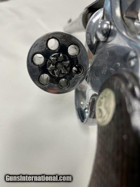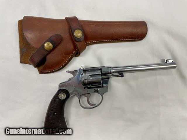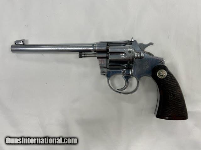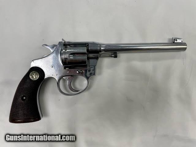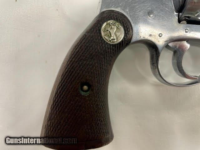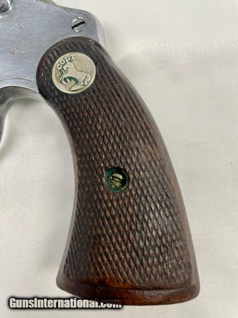 Description: Guns Listing ID: 868548 The Colt Police Positive was an improvement of Colt‚‚s earlier \"New Police\" revolver, upgraded with an internal hammer block safety. Colt named this new security device the \"Positive Lock\", and its nomenclature ended up being incorporated as a partial namesake for the new revolver.[2] The cylinder of the Police Positive rotated in the clockwise direction, the opposite of firearms maker Smith & Wesson‚‚s competing models. Ever a canny competitor in the firearms industry, Colt missed no opportunity to score points over its arch rival, and began a marketing campaign which accentuated this detail. In its advertising Colt proclaimed that \"All Colt cylinders TURN TO THE RIGHT\", and suggested that the Colt design forced the cylinder crane up against the frame, resulting in tighter lockup with less play and better chamber to barrel alignment, thus markedly increasing accuracy.[2] The Police Positive was very successful; along with the Colt Official Police it dominated the law enforcement firearms market in the early 1900s.[4] The Positive was itself incrementally modified in 1908, forming the basis for Colt‚‚s Police Positive Special model.[2] Weighing 22 ounces and available with a blued finish and black hard rubber grips in .22 Long Rifle, .22 WRF, .32 Long (and Short) Colt, and .32 Colt New Police (.32 S&W Long) chamberings, the First issue of this model featured an adjustable open iron sighted 6 inch barrel and was marketed from 1910 to 1925, with checked Walnut grips replacing the rubber ones after 1923. A Second issue was sold from 1926 to 1941 and differed from the First in that it had a slightly heftier frame which upped the weight to 26 ounces; also Colt‚‚s nickel finish was offered as an option SOLD Manufacturer: COLT Model: POLICE POSITIVE TARGET Caliber Info: 22 S/LR Condition: Used - Non-Certified Barrels: 6 BARREL Finish: NICKEL |