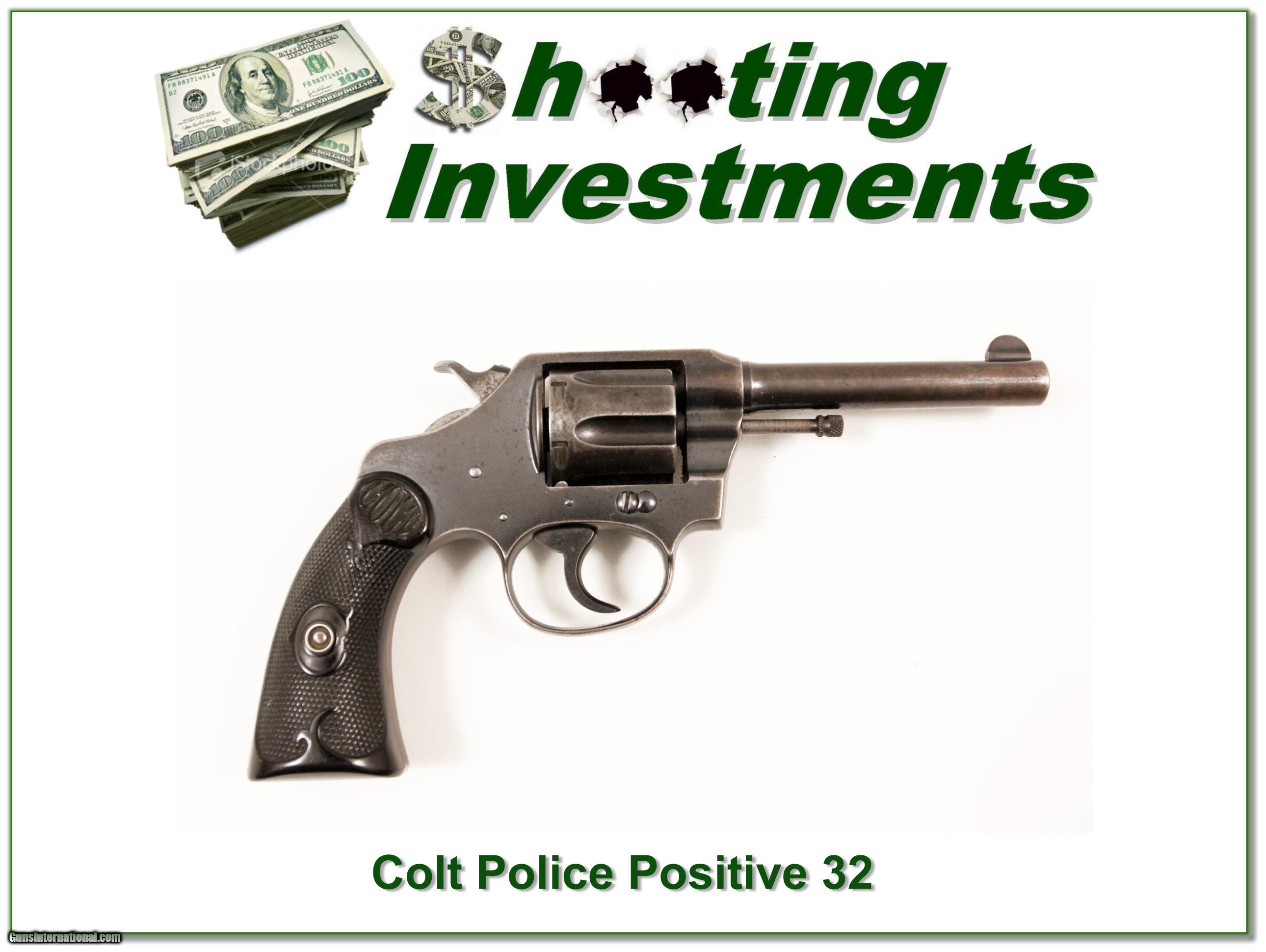 Description: This Colt was made in 1921. It is a Police Positive in 32 Police with 4in barrel. I am selling this one on consignment and as such lay-a-way can’t be used. It does of course have the standard 3 day inspection. Shipping and insurance is $30. Please email me with any questions or larger pictures. (I now consign quality firearms only 10%! Let me know if you have any you would like to sell!) [14-0880] Payment: Payment is by Money Order, Cashiers Check or Personal Check. I can now also accept MasterCard and Visa with a 3% convenience fee. PayPal can be used for some items but never firearms. Please let us know if you would like to pay via PayPal. Shipping: The shipping charge will be listed in each description. It is $30 for most guns. Some heavy guns or those insured for over $2000 may be higher. Shipments to Alaska and Hawaii are higher because air shipment is required. Most firearms are shipped within 5 days of receipt of payment. We prefer shipping at the beginning of the week to avoid firearms in transit over weekends. We package all shipments carefully and insure them for the full purchase price, rounded up to the next $100. In the unlikely event that damage occurs, it is important that you save all packaging material for the claims process. Optics are shipped Priority Mail and most other non-firearm shipments are shipped First Class. Returns: Our return policy is simple. If for any reason you are not pleased with your purchase, you may return your item for a refund. The only exception is ammunition, it cannot be returned. It is important to us that you are happy. Guns cannot be fired or dissembled before returning them and must be returned in the same condition as received. Notification of a return must occur with-in 3 days of receipt at your dealer. Shipping, convenience and dealer fees are not refundable and are the responsibility of the buyer. Lay-a-way: If needed, we offer a 60 day lay-a-way option on most firearms. It is 1/3 now, 1/3 in 30 days and 1/3 in 60 days. Lay-a-way firearm sales are final. Consigning your firearms with Shooting Investments: We will help you get top dollar for your firearms. While most local guns shops charge 20% or more, our fee is only 10% with a minimum of $50. At your local gun shop it might take months to sell. Selling on-line provides instant access to thousands of interested buyers. You won’t find any other on-line dealer willing to sell your firearms for only 10% or listing every gun on 4 separate s. Selling through an House typically costs the seller 15% and the buyer an addition 15% (so 30%) and you have to wait several months to sell and longer to receive funds. If properly priced, we will sell your firearms in a week or two. Send us an email or give us a call and we’ll explain how easy it is for you to get top dollar. Trading: We collect guns and usually just trade for guns we want to add to our collections. We often sell guns for others wanting to purchase one of ours. We find this the most fair to both of us. Our Commission is only 10% and we hold the gun you want until yours sells. Please contact us if you want to sell one of yours to buy one of ours. Help for California Buyers: We are happy to ship to California. It is the buyer’s responsibility to make sure any item you buy is legal in your state. We are also happy to help with your purchase of a firearm from someone other than us. If you see a gun you would like to buy but the seller can’t or won’t ship to California we can help. You buy the gun and have it shipped to us. We’ll then ship it to your California dealer. The cost for this service is only $30 + shipping. Let me know if we can help! SOLD |