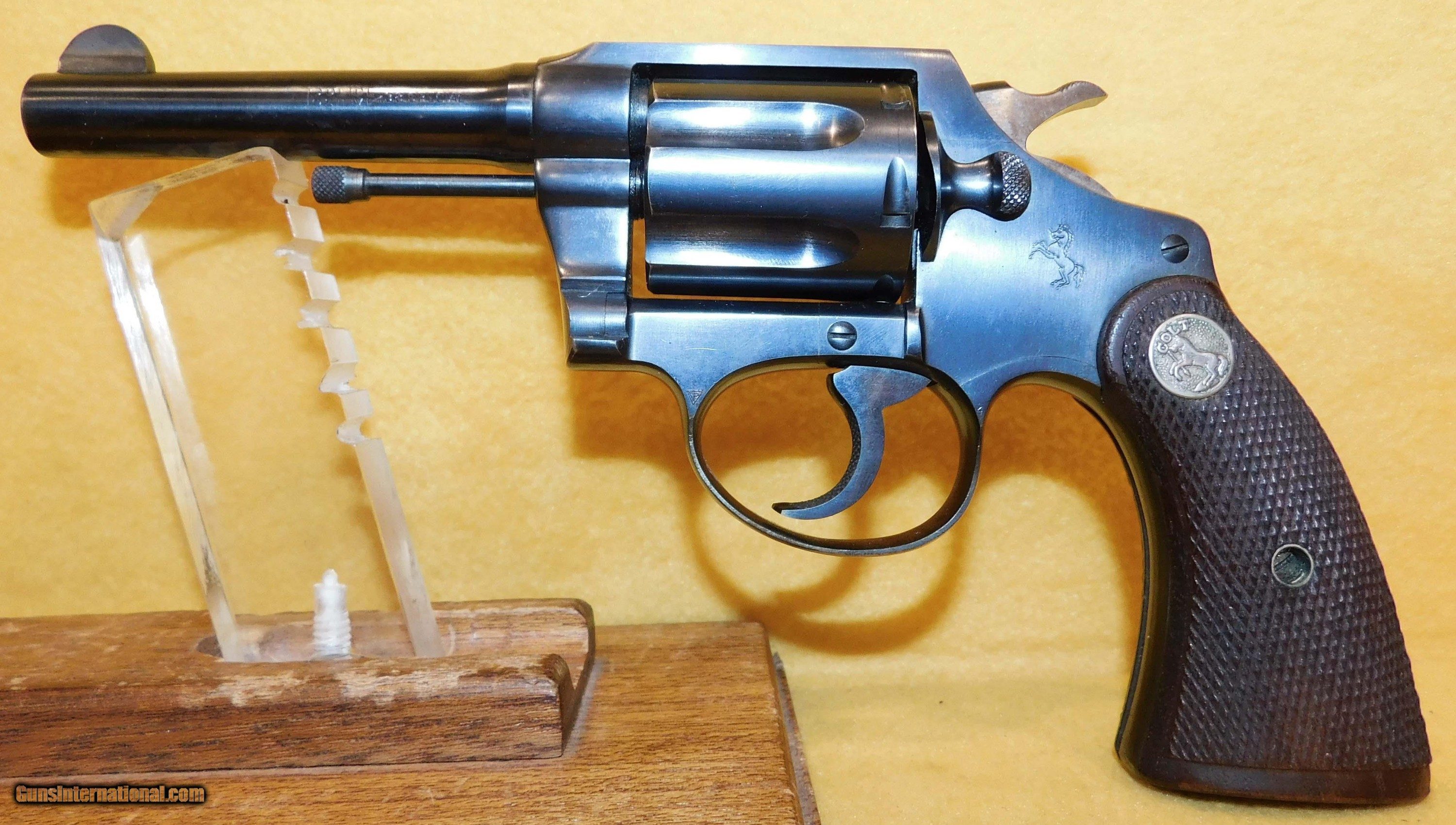 Description: COLT POLICE POSITIVE IN .38 SPECIAL CAL., WITH 4" BARREL. COLOR BLUE. CONDITION 97%. SERIAL NUMBER 465175. COLT POLICE POSITIVE (CIRCA 1938) IN .38 SPECIAL CALIBER, MIRROR BORE, CHECKERED WALNUT GRIPS EXCELLENT, 97% OVERALL CONDITION, OUR STOCK # D2424 SOLD |