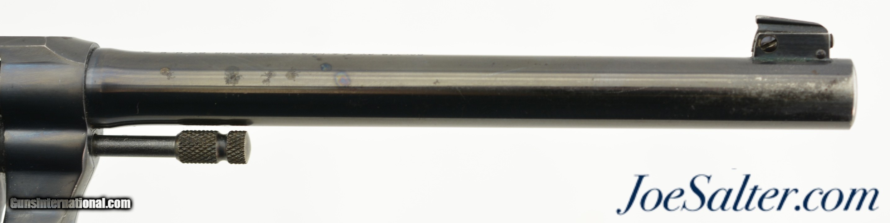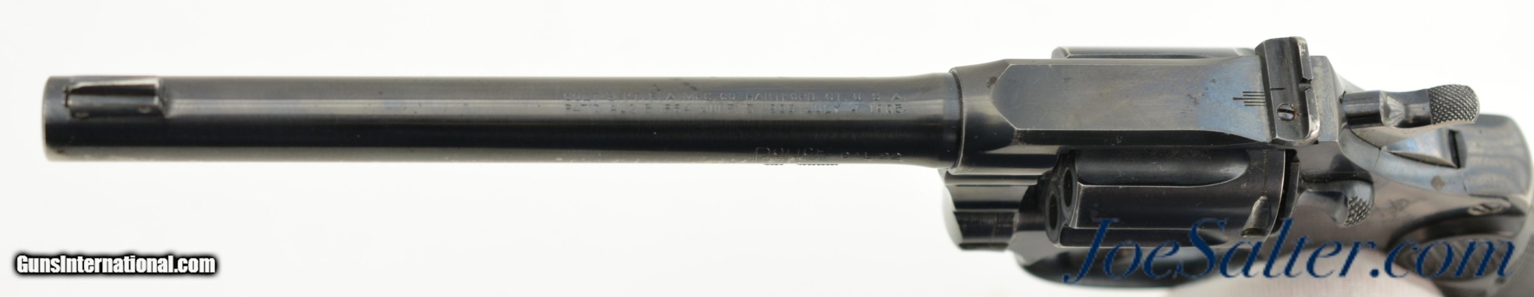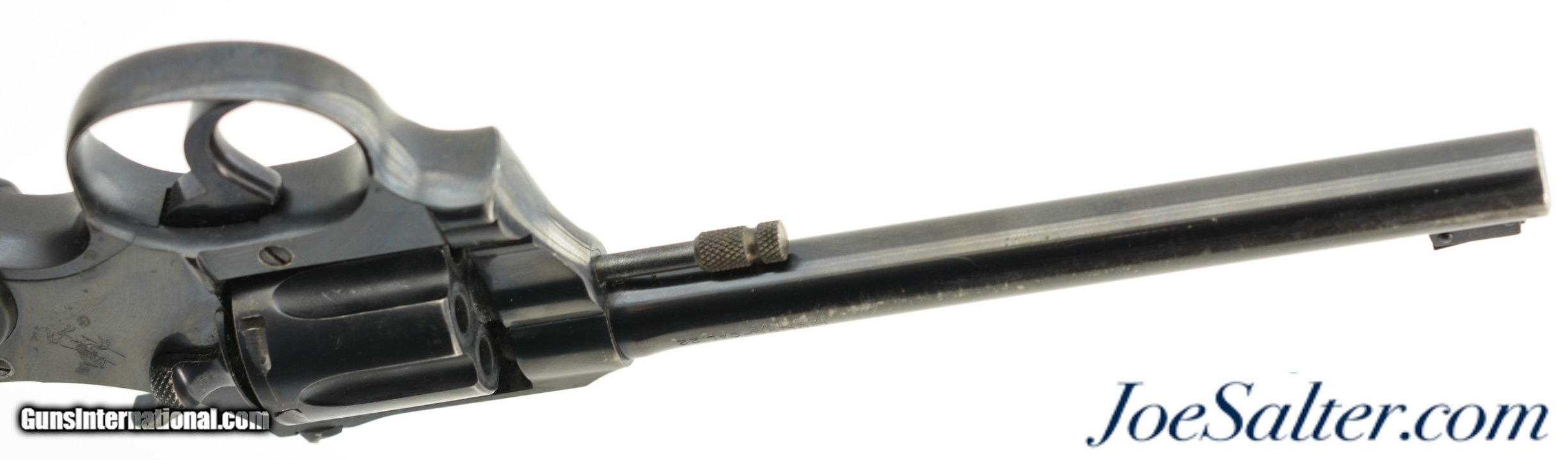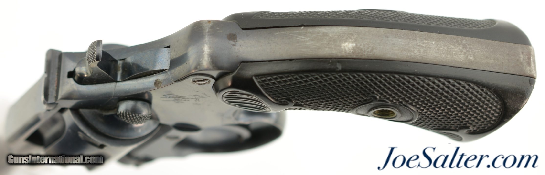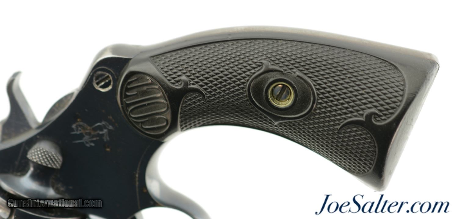 Description: Serial #21280, .22 LR, 6" barrel with an excellent, bright bore. This is a 1923-made revolver that retains 85-90% of the original bright blue finish with some silvering along the high edges and projections, a light turn-ring on the cylinder, and most of the loss occurring on the sides of the barrel at the muzzle, as well as along the gripstraps. The original target bead front and adjustable rea sights are still present. The checkered hard rubber Colt grips are in fine shape, with only minor handling marks and some mild flattening to the points. The lock-up is tight, and the action functions flawlessly. This is a fine small frame DA Colt overall. FFL or C&R SOLD Curio/Relic: Yes |