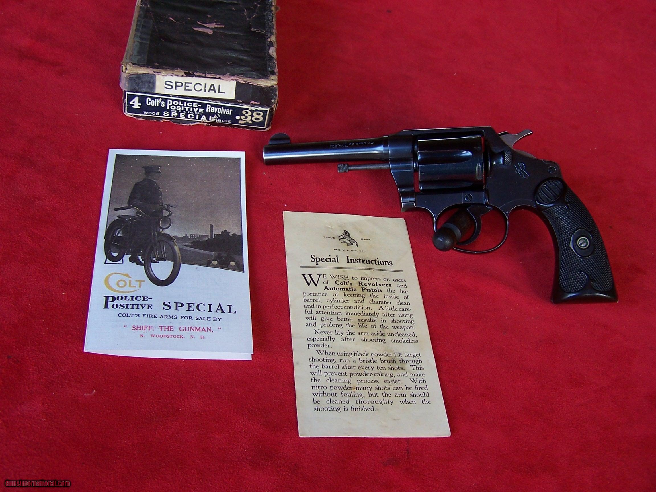 Description: Offered is a pre war Colt Police Positive Special with a 4" barrel in the very desirable 38 Special caliber. This gun dates to 1920 and remains in 98% condition. It comes with the box and paperwork. It also includes the original ownership papers from the 1920's. A copy of a 1920's Colt Police Positive Special brochure is also included. The gun has the small grip frame with the Fleur-De-Lis hard rubber stocks. The gun is mechanically like new and looks excellent. The original Colt box does show some wear and a piece is missing along the right side on the top lid. I offer a three day non firing inspection period and always want the buyer to be satisfied with their purchase. The gun will be packed correctly with the gun in a zipper sleeve and shipped via FedEx Air with insurance to your FFL dealer in the continental United States for $55 (California is extra because I have to ship through my local dealer). This gun requires a C&R or FFL license for transfer. I ship the following day after the payment arrives and provide tracking information. Please see my other Colts and various collectible firearms that I have listed. Thanks for your interest and please let me know if you have any questions. Price is $925 plus shipping. Please Note: A same as cash price Lay-A-Way plan is available on this gun. Please call to discuss. Sold pending funds. SOLD Curio/Relic: Yes Manufacturer: Colt Model: Police Positive Special .38 Serial Number: S/N 206727 Caliber Info: .38 Special Bore: Excellent Condition: 98% Metal Condition: 98% Bore Condition: Excellent Barrels: 4" long