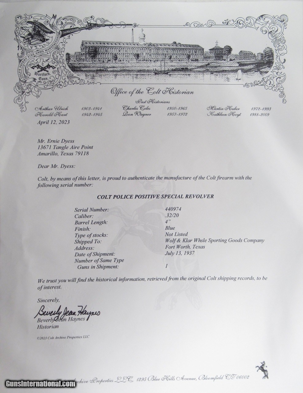 TEXAS SHIPPED WOLF & KLAR CUSTOMIZED COLT POLICE POSITIVE REVOLVER from COLLECTING TEXAS – FACTORY LETTER – SHIPPED 1937