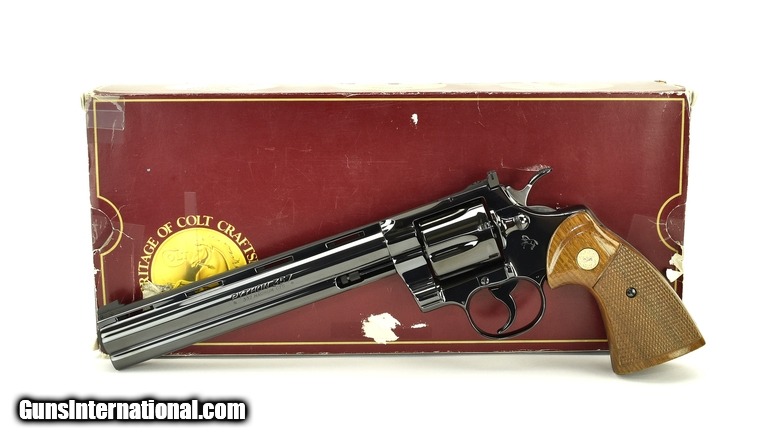 Colt Python .357 Mag caliber revolver. 8” model with royal blue finish, made in 1987. Mint condition with box and factory letter.