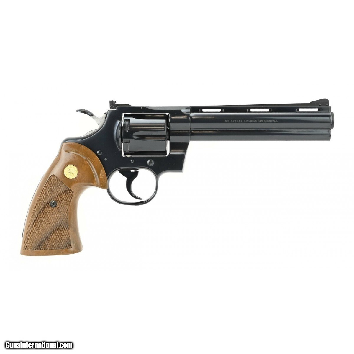 Description: " Colt Python .357 Magnum caliber revolver. 6 inch Blue model made in 1975. Has wear to the finish on the barrel. Grips are replaced. Very good condition.