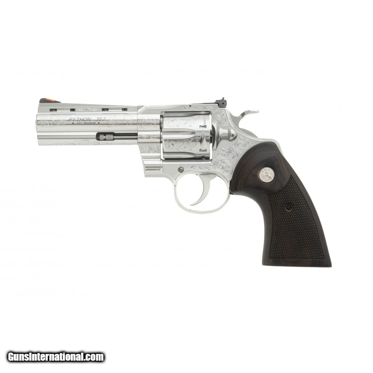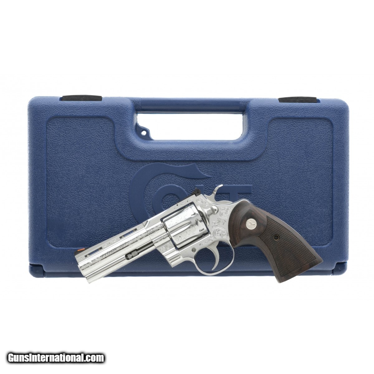 Modern stainless 4.25"" barrel Python with ""C+"" Coverage Armory cut engraved model. Custom Shop Model D. NEW. UPC:098289003287