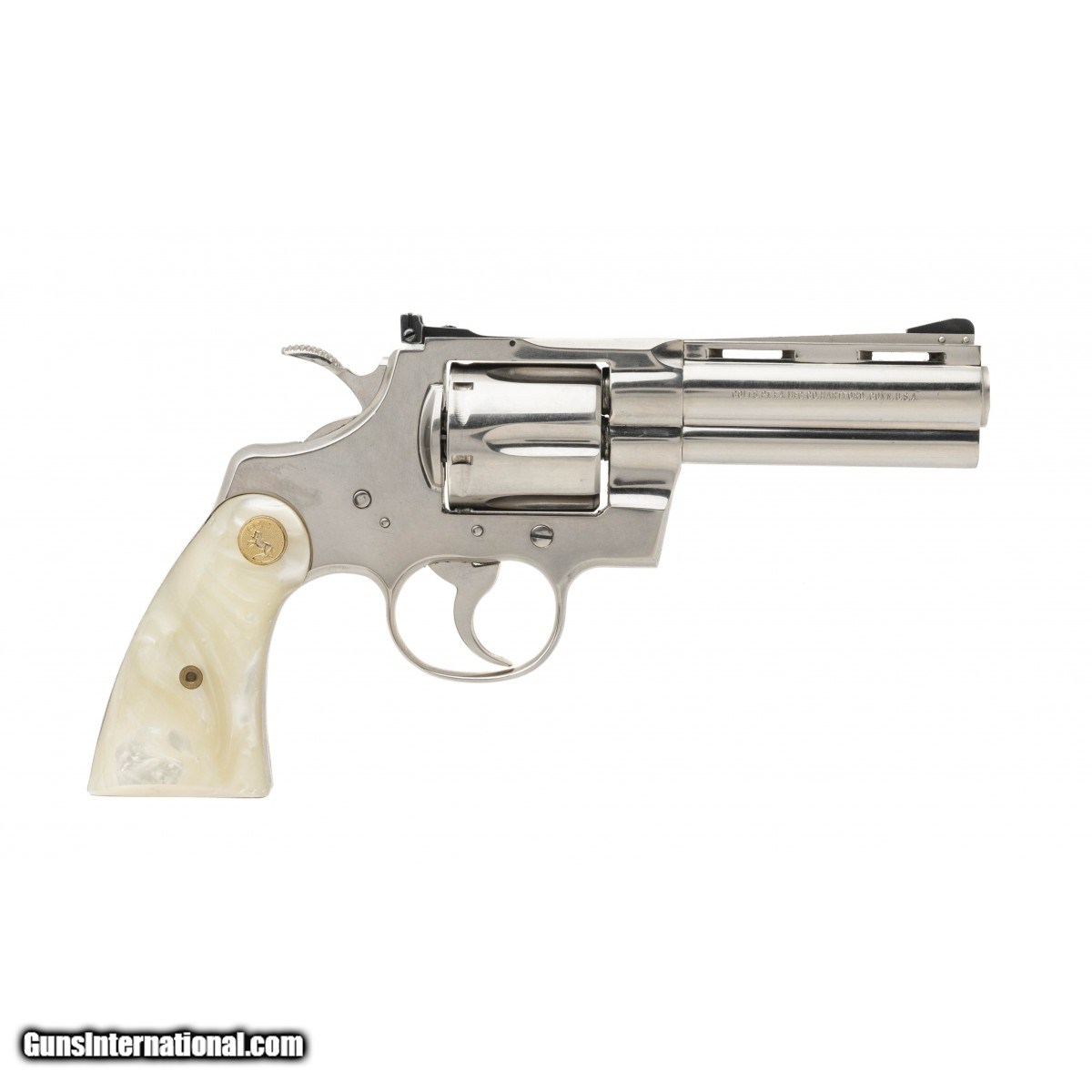 Description: " SN: 18685E, Made circa 1976, .357 Magnum with a 4"" Barrel. Bore is in excellent condition. DA/SA Revolver with adjustable rear sights, Approx. 100% Factory Nickel finish, Colt Feaux pearl grips and the top of the barrel flat has the name ""Fermin Centeno"" engraved on it. Overall excellent condition. SOLD |