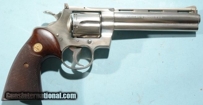 Description: 1966 COLT PYTHON NICKEL 6" .357 MAGNUM REVOLVER. Serial number "602XX" and matching. Factory original nickel at 99.9% with some cloudiness in some areas(will buff out). Original grips with a few small storage dingsat butt and finish checks(see photos). Mint bore and rifling. Excellent lockup and timing with smooth Colt action. Has not seen much use with only slight drag line on cylinder so not even cycled much. Been in safe for 30 years. No box. SOLD Curio/Relic: Yes Handgun Caliber: .357 Magnum |