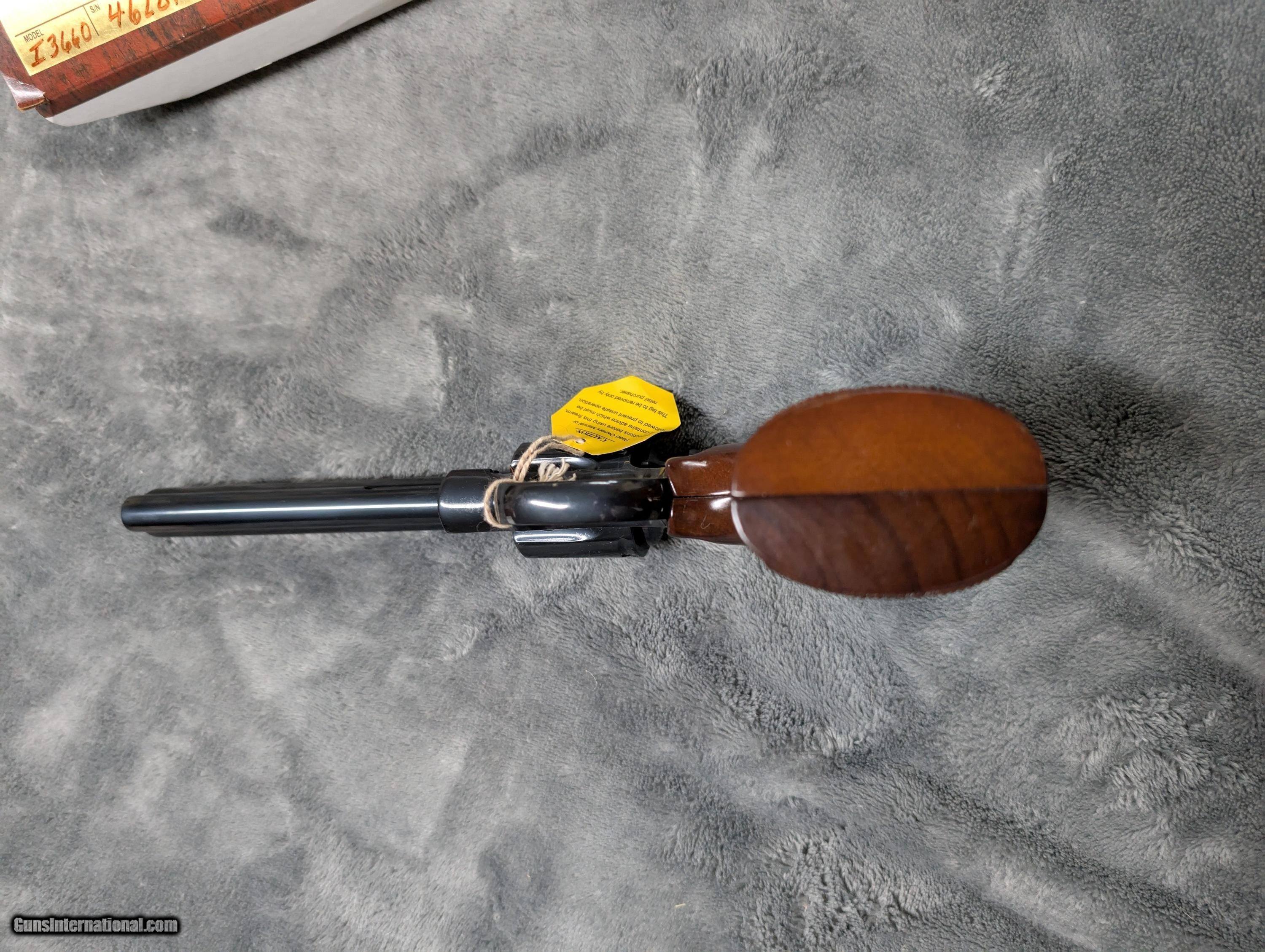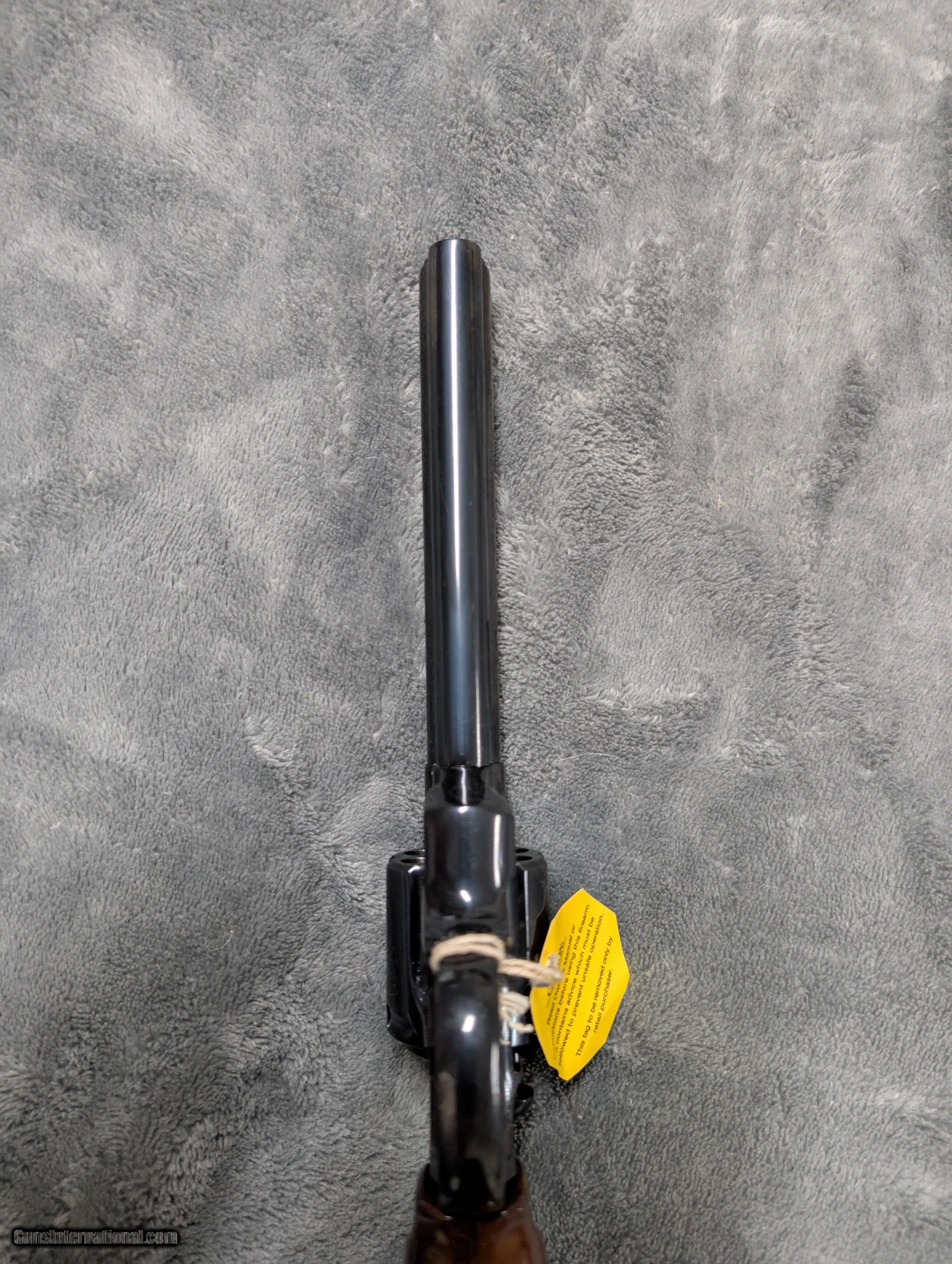 This 1976 Colt Python 357 with 6" barrel remains in Excellent / Almost Unfired Condition. It bears German Proofs from 1976, from the Munich Proofhouse, apparently it was originally inteded for the German Market. It does have import marks hidden under the grips. It was imported back into the USA by Heritage Arms of Naples FL. It does not appear to have seen any real use. There is a very faint turn line and scuffing present on the recoil shield. There is a very small amount of bluing loss(edge wear) on the sharp edge at the muzzle on the right side. Otherwize it retains pretty much all of its original finish.