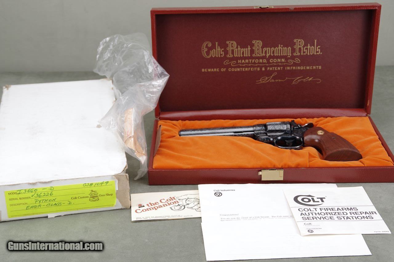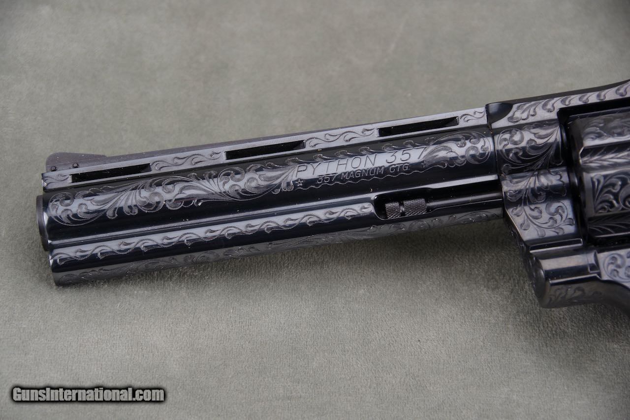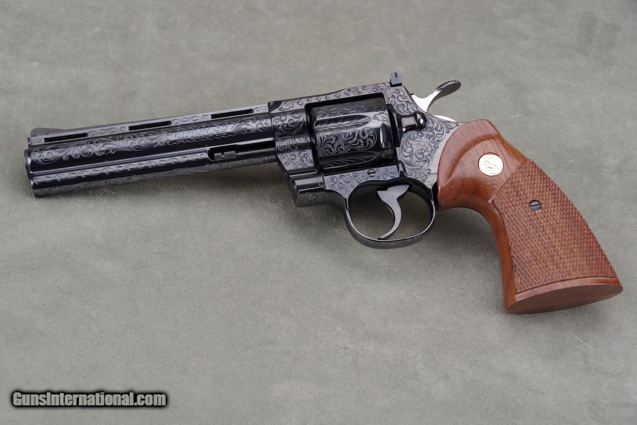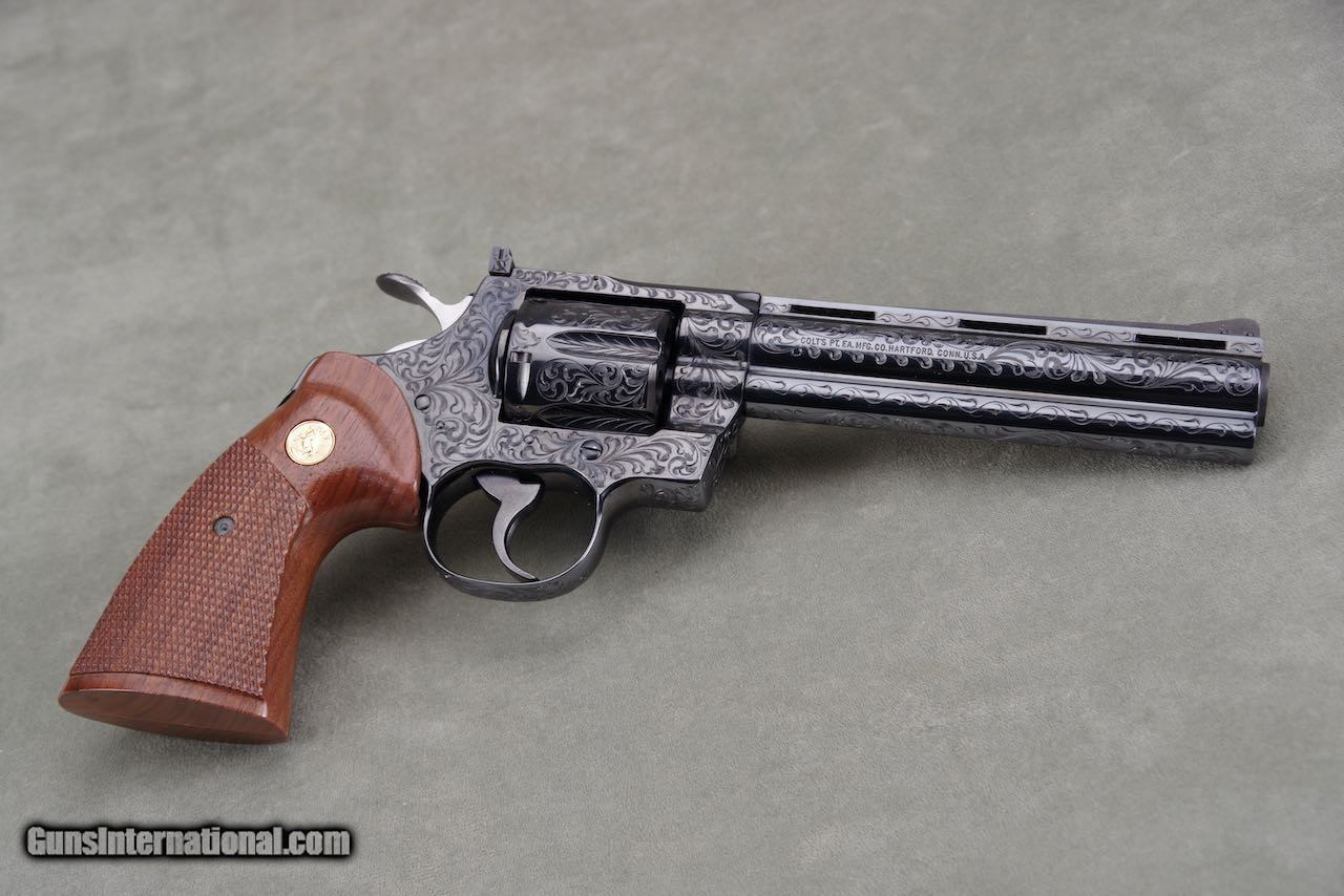 Description: 1978 Collt Python chambered in 357 magnum with a 6 inch barrel and factory royal blue finish. This revolver is factory D engraved (100% Coverage). It is new in the Custom Shop box numbered to the gun with all of the paperwork shown. It is a no excuses collector great example. As seen in the photos there is zero handling or detractions. Overall the finish rates 100%. The factory target grips are in the same excellent condition as the gun itself with sharp checkers throughout. Full coverage engroved Pythons seldom come to market. This one can not be improved on. SOLD Handgun Caliber: .357 Magnum Manufacturer: colt Model: python |