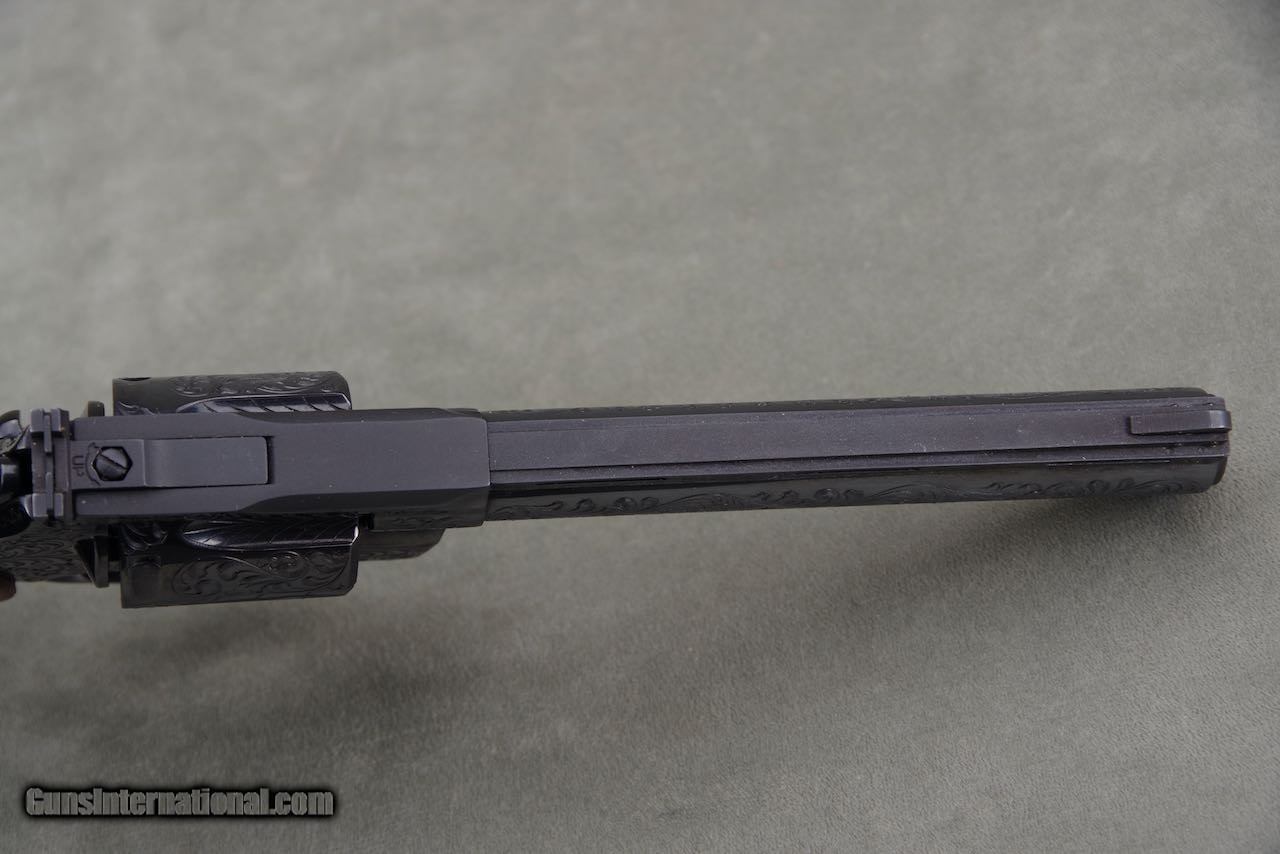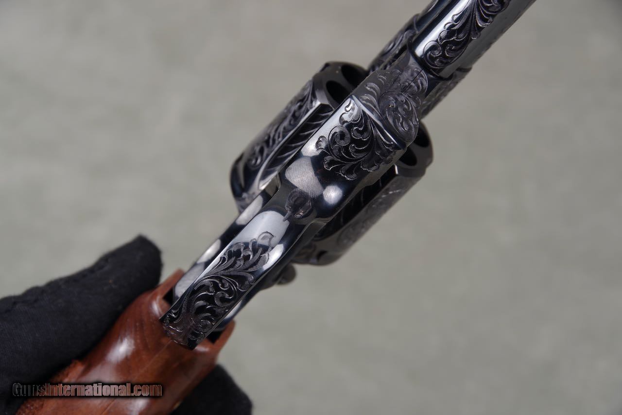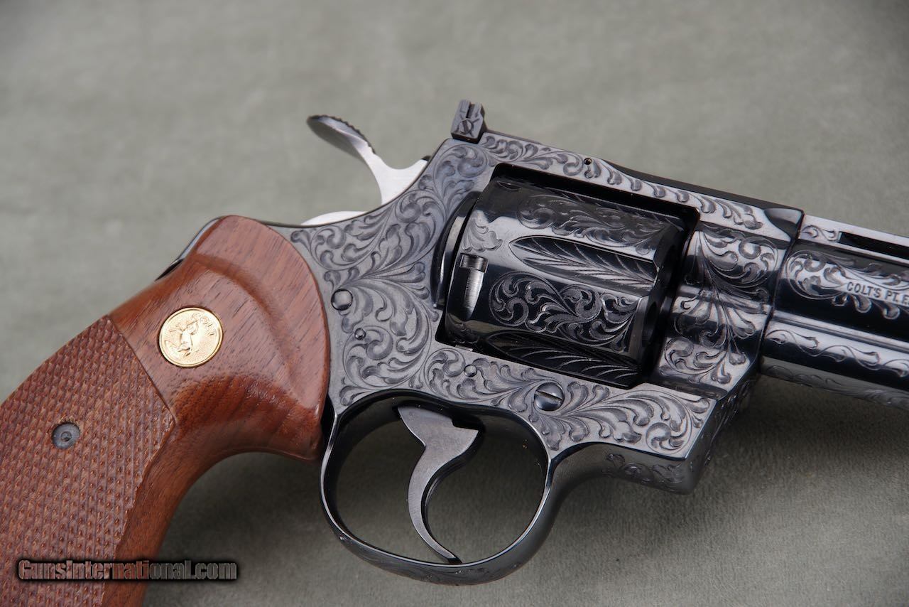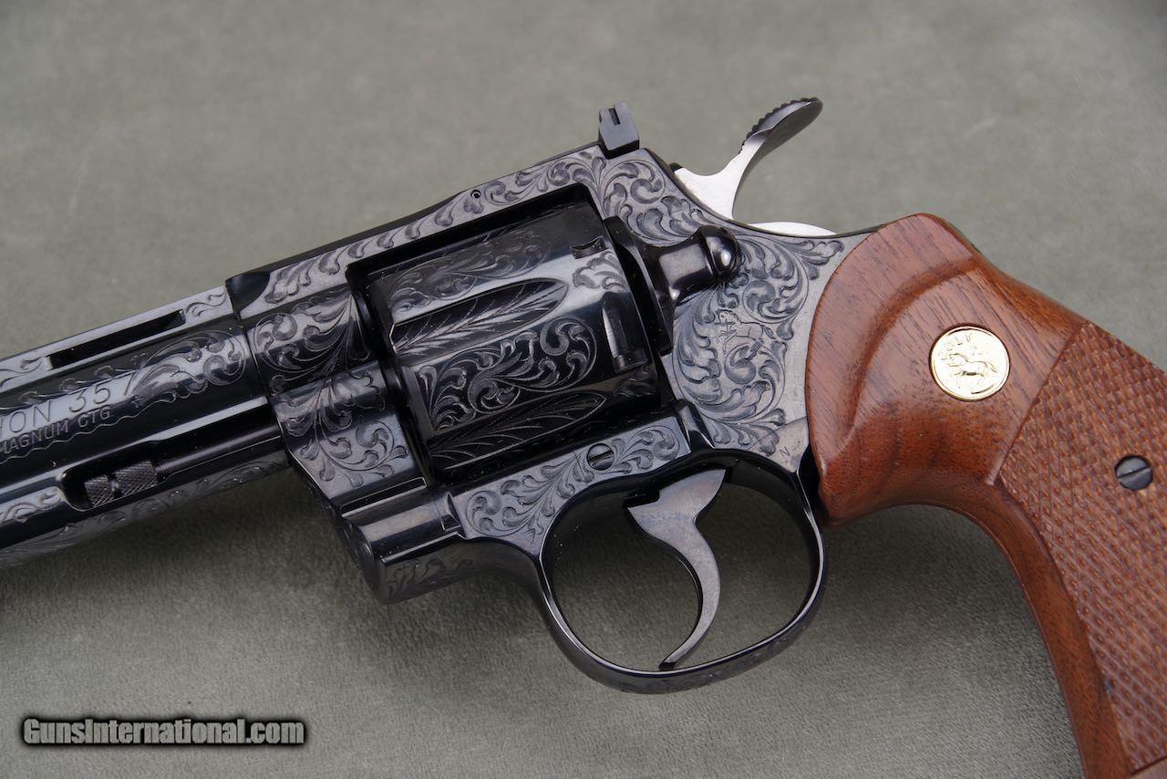 Description: 1978 Collt Python chambered in 357 magnum with a 6 inch barrel and factory royal blue finish. This revolver is factory D engraved (100% Coverage). It is new in the Custom Shop box numbered to the gun with all of the paperwork shown. It is a no excuses collector great example. As seen in the photos there is zero handling or detractions. Overall the finish rates 100%. The factory target grips are in the same excellent condition as the gun itself with sharp checkers throughout. Full coverage engroved Pythons seldom come to market. This one can not be improved on. SOLD Handgun Caliber: .357 Magnum Manufacturer: colt Model: python |