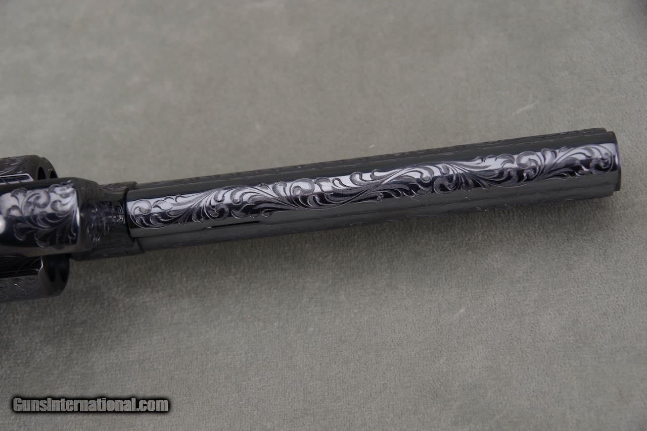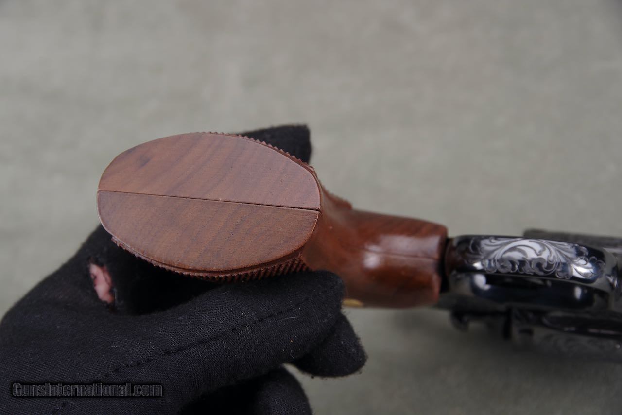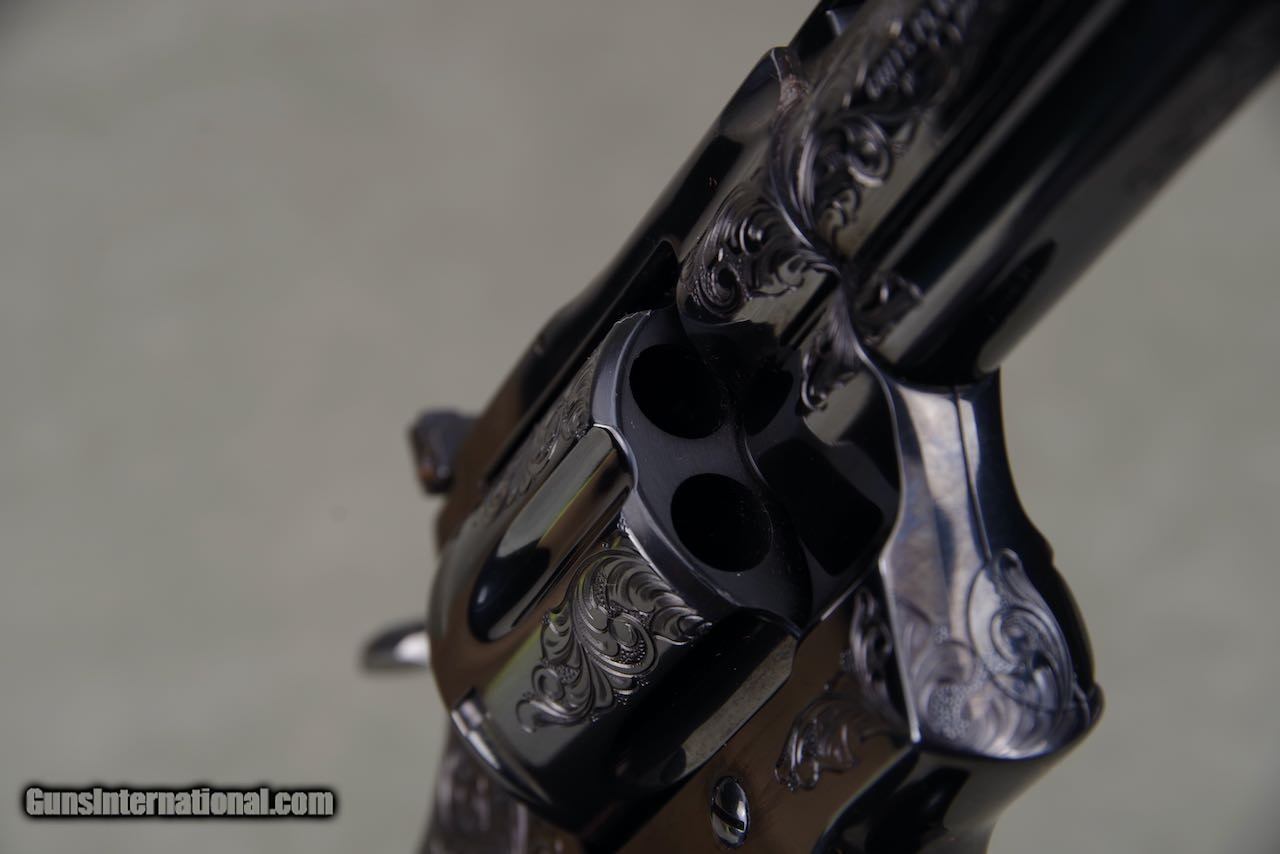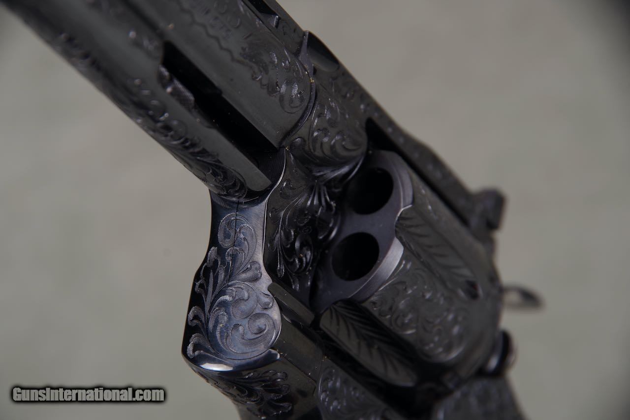 Description: 1978 Collt Python chambered in 357 magnum with a 6 inch barrel and factory royal blue finish. This revolver is factory D engraved (100% Coverage). It is new in the Custom Shop box numbered to the gun with all of the paperwork shown. It is a no excuses collector great example. As seen in the photos there is zero handling or detractions. Overall the finish rates 100%. The factory target grips are in the same excellent condition as the gun itself with sharp checkers throughout. Full coverage engroved Pythons seldom come to market. This one can not be improved on. SOLD Handgun Caliber: .357 Magnum Manufacturer: colt Model: python |