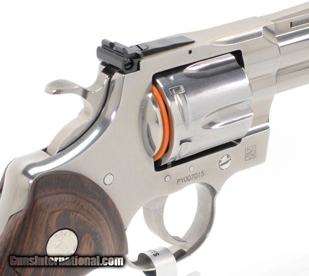 Description: BRAND NEW 2020-2021 Colt Python .357 Mag SP4WTS 4.25 Inch. In Blue Hard Case AVAILABLE FOR PURCHASE AT OUR ON-LINE STORE The 2020-2021 Python features modern stainless steel alloys and a re-designed rear sight. Thirty percent more steel beneath the rear adjustable target sight gives you a stronger revolver and more robust shooting experience. A recessed target crown, user-interchangeable front sight, and Walnut grip with the iconic Colt medallion make this a gun you’ll want to shoot AND show off. The Python is chambered in .357 Magnum and also accommodates 38 Special cartridges. The Serial Number of the revolver is PY212113. The photos in this ad are stock and thus the serial number on it does not reflect the one on the revolver you will be receiving. SPECIFICATIONS
