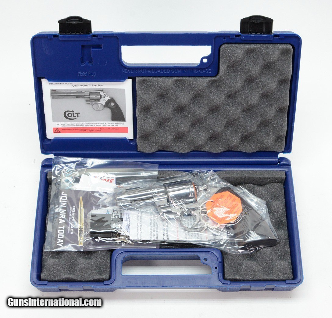 Description: BRAND NEW 2020 Colt Python .357 Mag SP3WTS 3 Inch. In Blue Hard Case. AVAILABLE FOR PURCHASE AT OUR ON-LINE STORE We are proud to offer a selection of the NEW 2020 Colt Python. In Stock! The Python is back! Building on Colt’s Snake Gun legacy, the legendary double-action revolver returns in stainless steel in 3", 4.25” and 6” barrel lengths. The 2020 Python features modern stainless steel alloys and a re-designed rear sight. Thirty percent more steel beneath the rear adjustable target sight gives you a stronger revolver and more robust shooting experience. A recessed target crown, user-interchangeable front sight, and Walnut grip with the iconic Colt medallion make this a gun you’ll want to shoot AND show off! The photos in this ad may be stock and thus the serial number on the firearm may not reflect the one on the revolver you will be receiving. The Serial Number for this revolver is, PY237683
