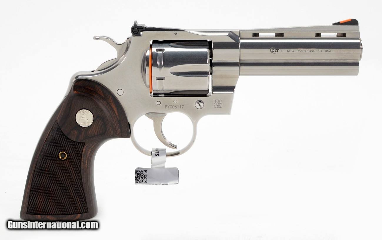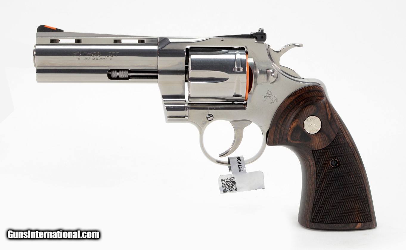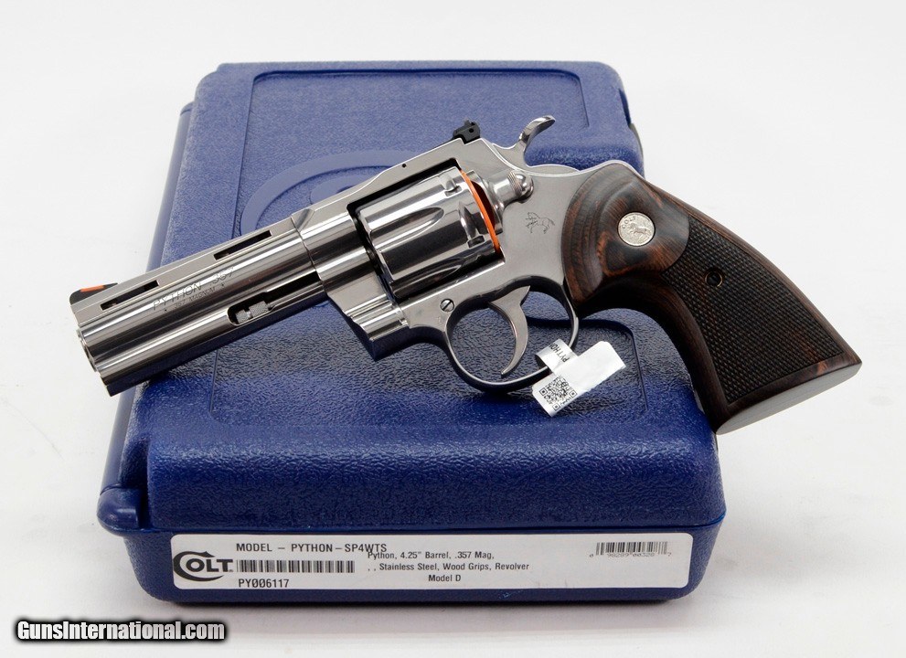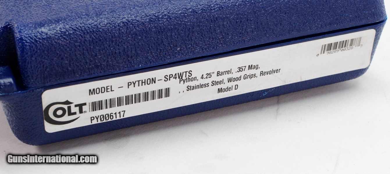 Description: BRAND NEW 2020 Colt Python .357 Mag SP4WTS 4.25 Inch. In Blue Hard Case. Blemished AVAILABLE FOR PURCHASE AT OUR ON-LINE STORE The Python Is Back! Building on Colt’s Snake Gun legacy, the legendary double-action revolver returns in stainless steel in 4.25” and 6” barrel lengths. The 2020 Python features modern stainless steel alloys and a re-designed rear sight. Thirty percent more steel beneath the rear adjustable target sight gives you a stronger revolver and more robust shooting experience. A recessed target crown, user-interchangeable front sight, and Walnut grip with the iconic Colt medallion make this a gun you’ll want to shoot AND show off. The Python is chambered in .357 Magnum and also accommodates 38 Special cartridges. This is a blemished item received directly from Colt. The operation is warranted by Colt, however the finish is not. We visually inspect blemished items that we receive and rarely find any flaws in the finish. This item is Sold As Is, due to this caveat. Please review images carefully. This is a great opportunity to own a legendary Colt Python at an incredible price! The revolver is #PY006117, a highly collectable early production, low serial number. SPECIFICATIONS