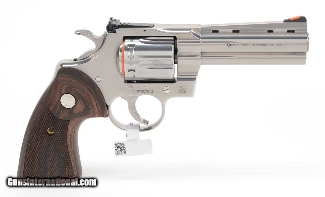 Description: BRAND NEW 2020 Colt Python .357 Mag SP4WTS 4.25 Inch. In Blue Hard Case We are proud to offer a selection of the NEW 2020 Colt Python. In Stock! The Python is back. Building on Colt’s Snake Gun legacy, the legendary double-action revolver returns in stainless steel in 4.25” and 6” barrel lengths. The 2020 Python features modern stainless steel alloys and a re-designed rear sight. Thirty percent more steel beneath the rear adjustable target sight gives you a stronger revolver and more robust shooting experience. A recessed target crown, user-interchangeable front sight, and Walnut grip with the iconic Colt medallion make this a gun you’ll want to shoot AND show off. The Python is chambered in .357 Magnum and also accommodates 38 Special cartridges. The Serial Number of the revolver is PY017572. The photos in this ad are stock and thus the serial number on it does not reflect the one on the revolver you will be receiving. SPECIFICATIONS