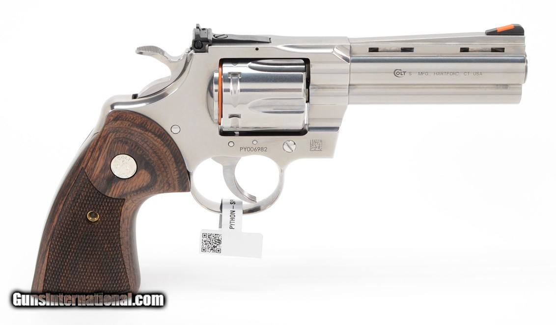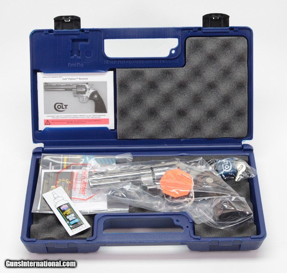 Description: BRAND NEW 2020 Colt Python .357 Mag SP4WTS 4.25 Inch. In Blue Hard Case We are proud to offer a selection of the NEW 2020 Colt Python. In Stock! The Python is back. Building on Colt’s Snake Gun legacy, the legendary double-action revolver returns in stainless steel in 4.25” and 6” barrel lengths. The 2020 Python features modern stainless steel alloys and a re-designed rear sight. Thirty percent more steel beneath the rear adjustable target sight gives you a stronger revolver and more robust shooting experience. A recessed target crown, user-interchangeable front sight, and Walnut grip with the iconic Colt medallion make this a gun you’ll want to shoot AND show off. The Python is chambered in .357 Magnum and also accommodates 38 Special cartridges. The Serial Number of the revolver is PY012423. The photos in this ad are stock and thus the serial number on it does not reflect the one on the revolver you will be receiving. SPECIFICATIONS